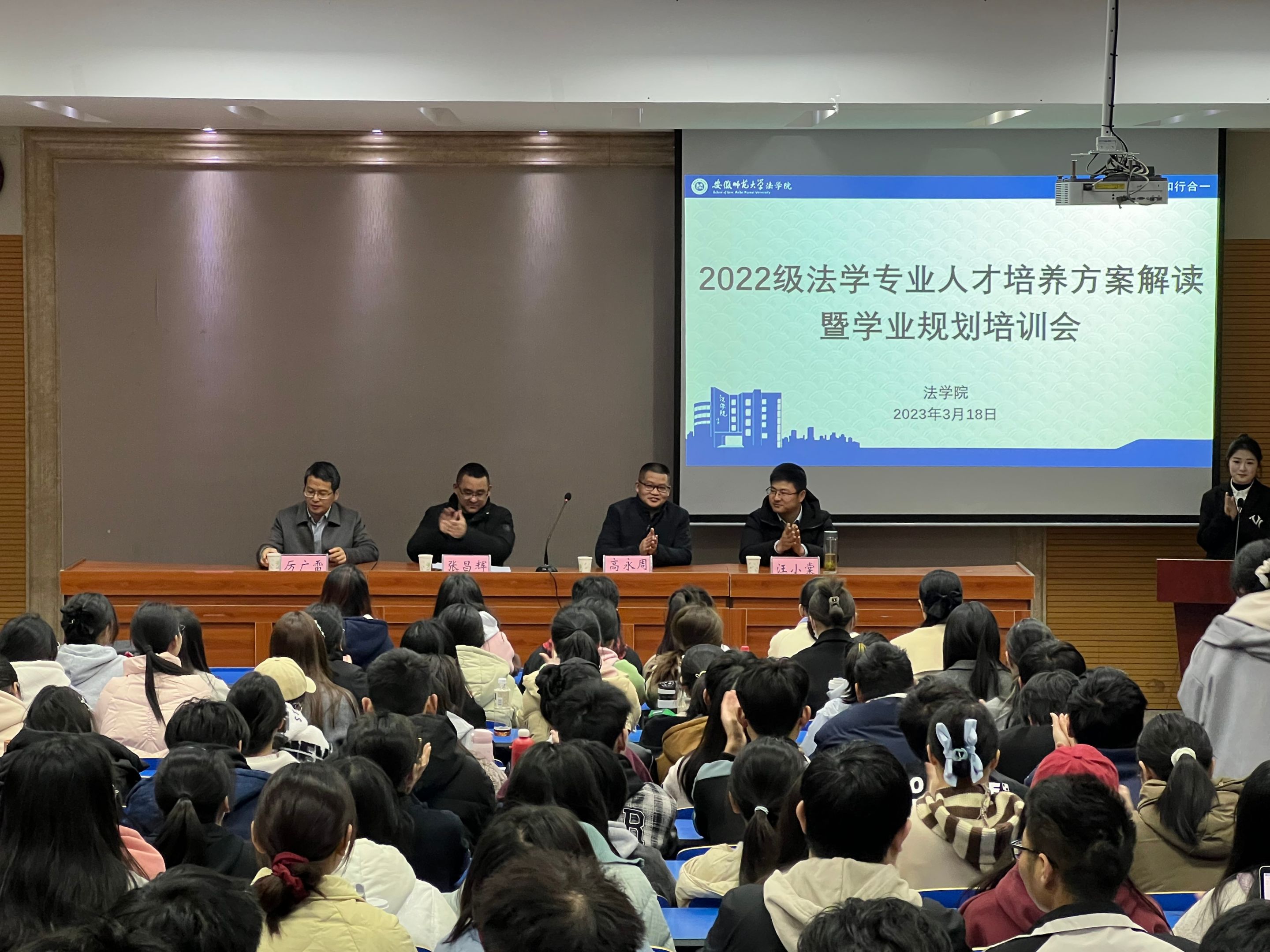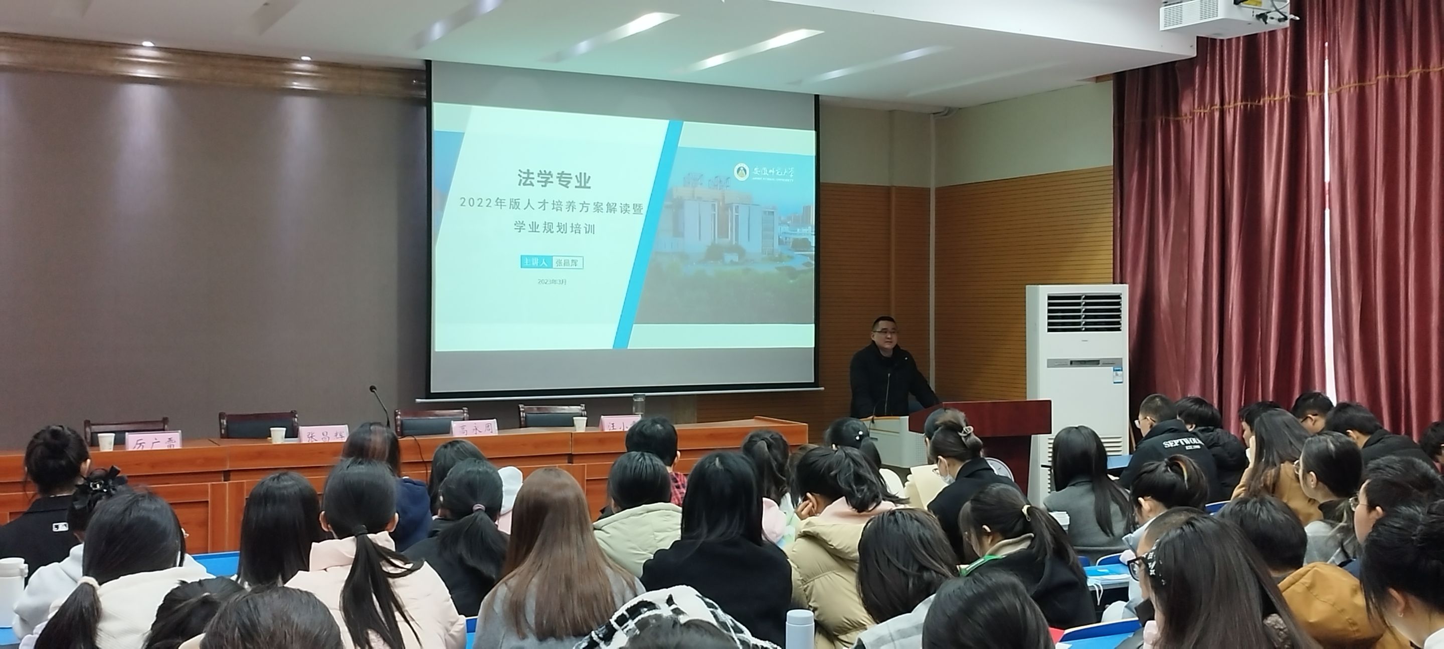 为认真贯彻学校有关2022级法学专业人才培养方案工作部署,进一步培育法学专业高质量人才,法学院于3月18日在天门山校区图书馆报告厅召开2022级法学专业培养方案解读暨学业规划培训会。本次会议由法学院副院长高永周、法学专业负责人张昌辉副教授、厉广雷老师、汪小棠老师主讲,2022级法学二班团支书张馨予主持,全体2022级法学专业同学参加。