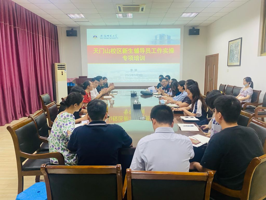 9月9日,天门山校区举办第三场新生辅导员开学初工作实操专题培训。学生处思想教育科科长李妍应邀做专题培训。天门山校区全体专兼职辅导员参加了培训会。培训由管委会办公室学生管理部部长左方敏主持。