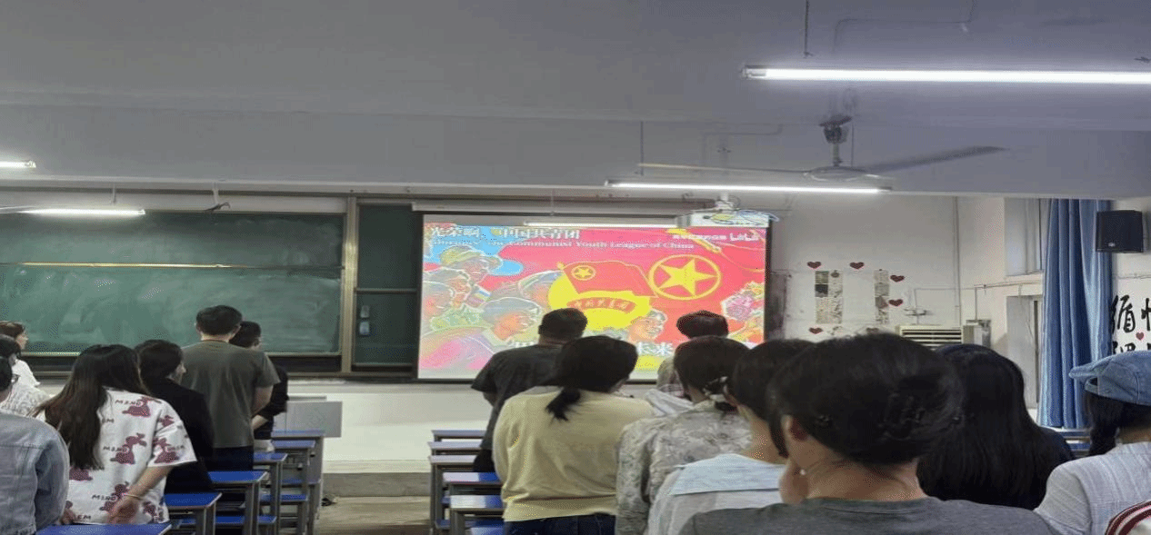 “我们是五月的花海,用青春拥抱时代……”会议伊始,全体团员青年庄严肃立,齐声高唱中国共产主义青年团团歌《光荣啊,中国共青团》。嘹亮的歌声回荡在教室中,团员们用饱满的热情唱出了对共青团组织的热爱与自豪,展现了新时代青年昂扬向上的精神风貌。李鑫在开场发言中指出“五四精神是青年奋斗的灯塔,我们要以歌声铭记初心,用实际行动践行‘请党放心,强国有我’的青春誓言。”