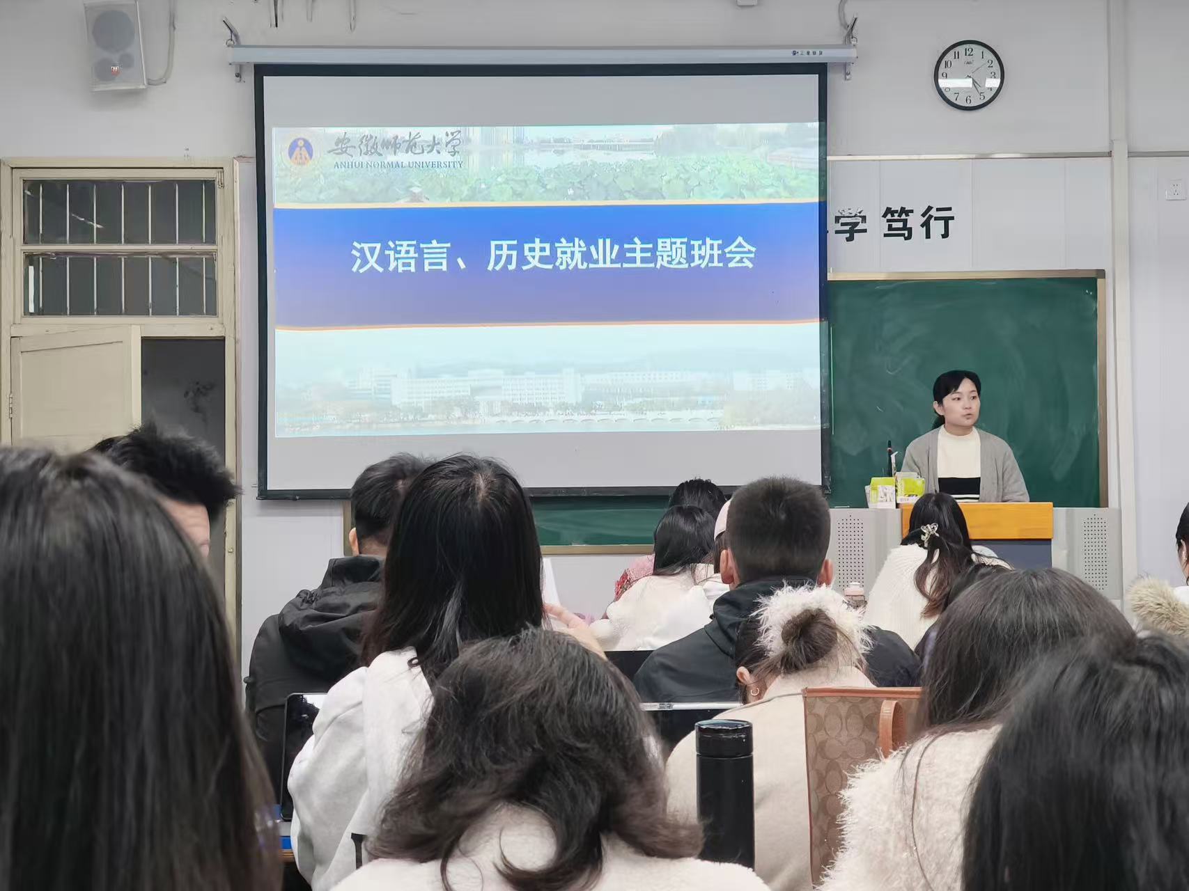 2025年11月4日,安徽师范大学天门山校区汉语言文学班组织召开“反诈警示与就业指导”主题班会。班会由辅导员马午梅主持,全体同学参加。