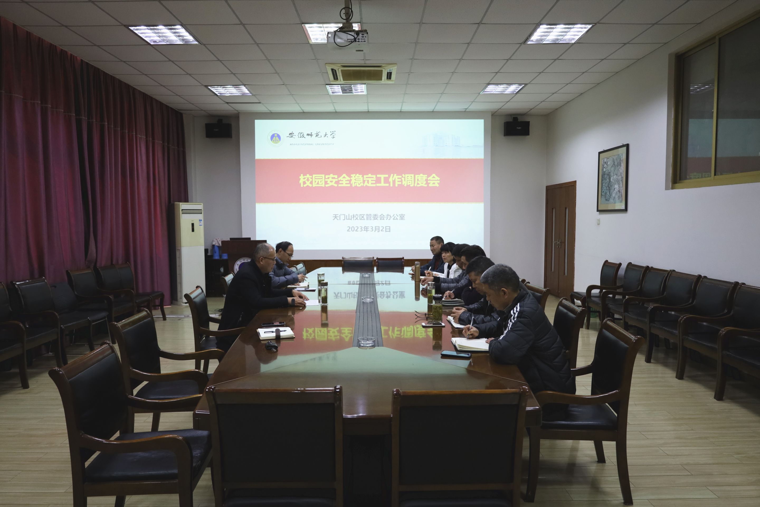 3月2日下午,天门山校区召开安全稳定工作调度会,教务管理部部长董书宝、综合部部长汪暠,校区保卫、物业、水电、食堂、维修、医务负责人参会。管委会办公室主任罗振主持会议并讲话。