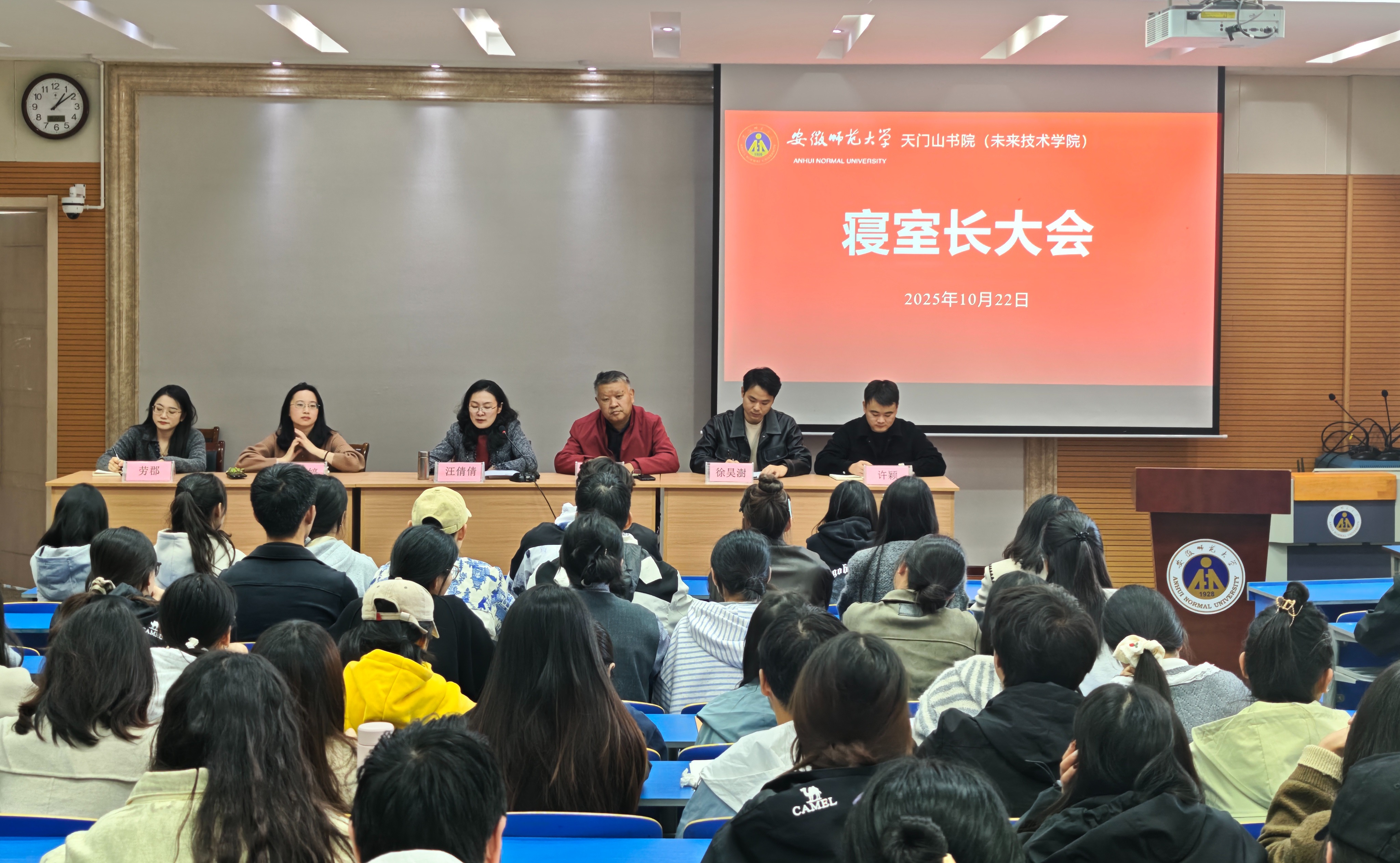 2025年10月22日下午,天门山书院(未来技术学院)在天门山校区图书馆一楼报告厅召开新生寝室长大会,书院党委副书记汪倩倩围绕 “护航” 背景下的寝室长工作展开培训。