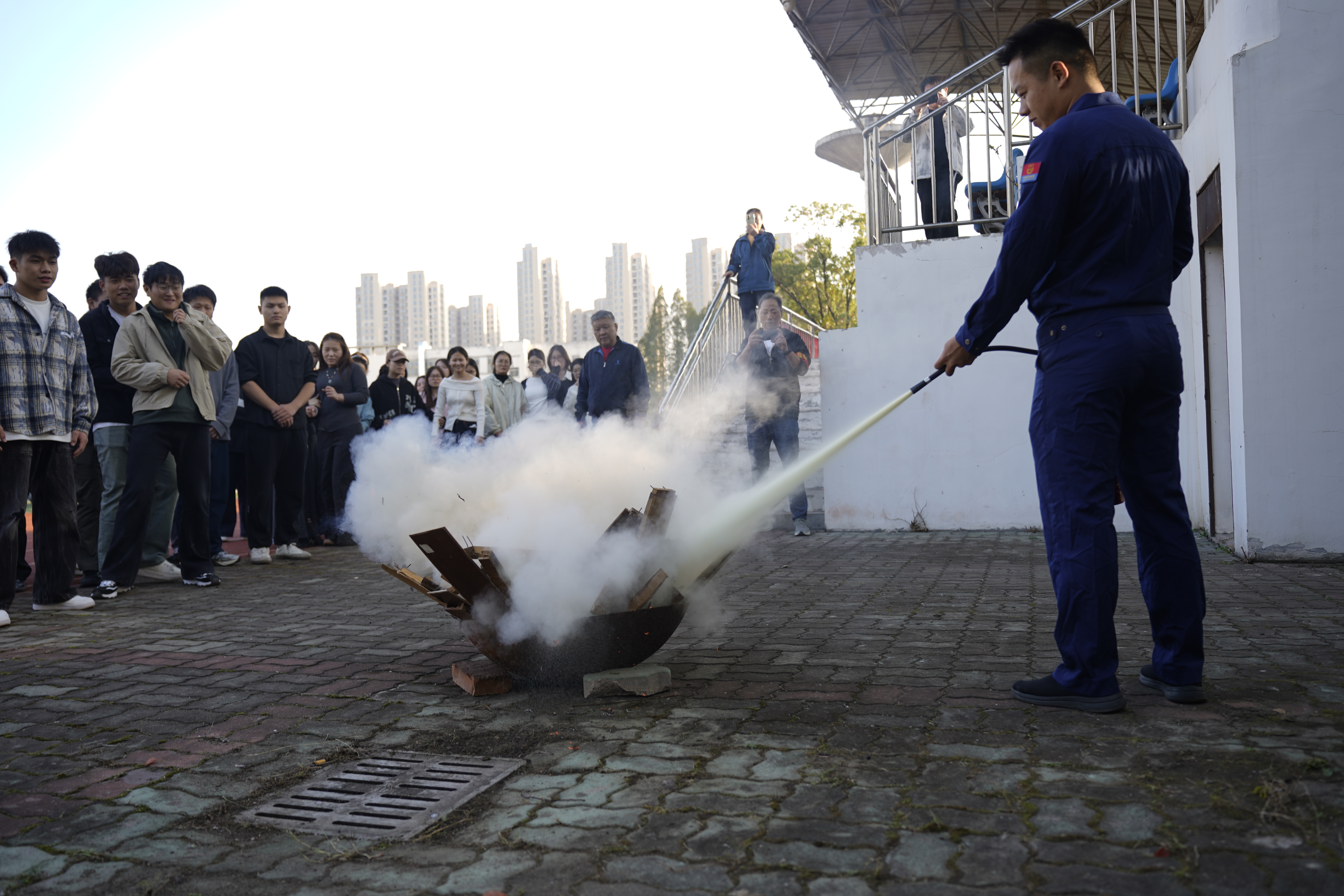 在集结点旁的实操培训区,经开区消防救援大队的教官结合真实案例,详细讲解了干粉灭火器的工作原理、适用场景及“提、拔、握、压”四步使用法。为让师生真正掌握技能,教官现场示范后,组织大家分组实操演练。师生们踊跃参与,亲手操作灭火器扑灭模拟火源,在实践中熟悉操作要领,切实提升了初期火灾扑救能力。