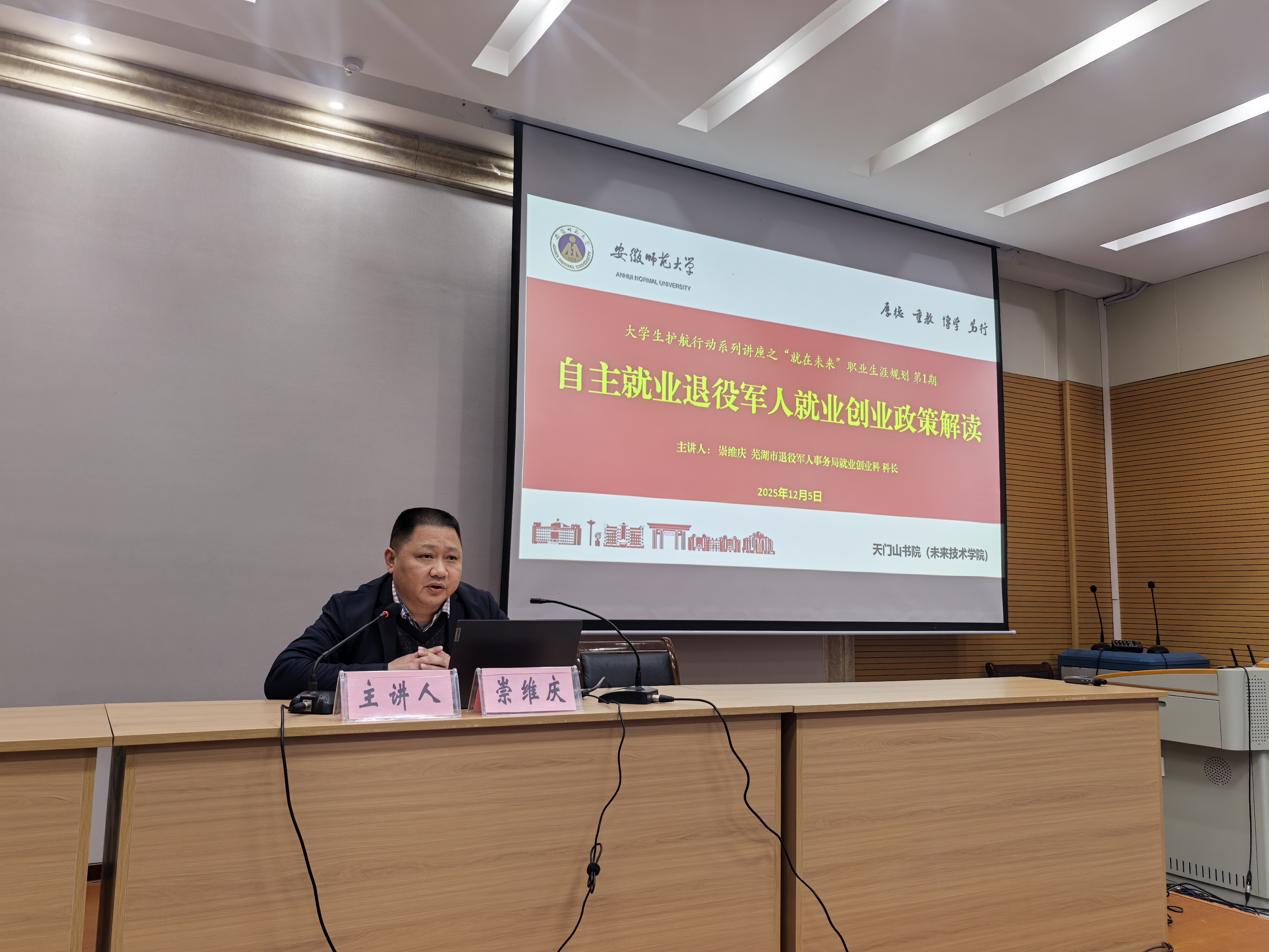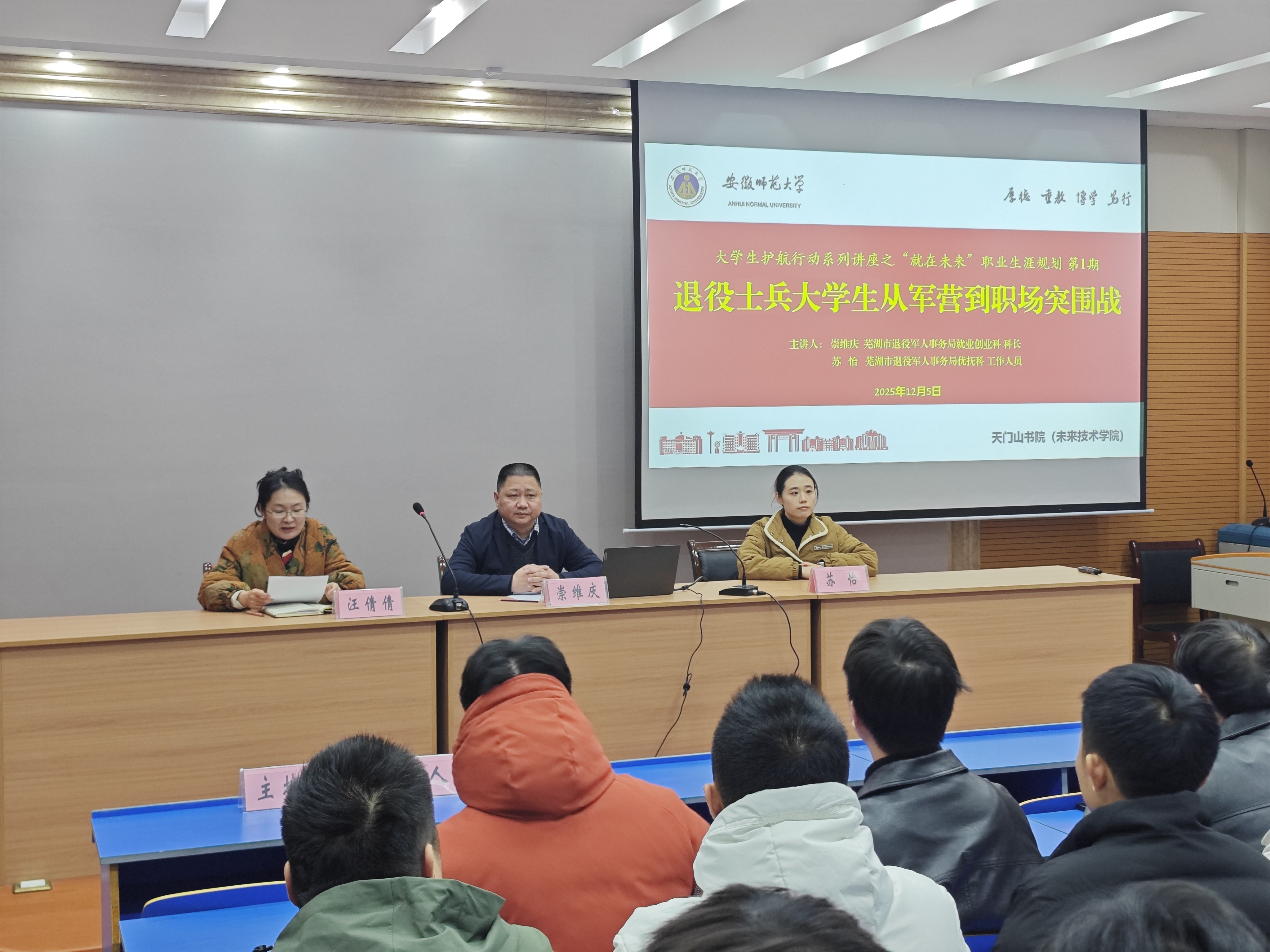 为帮助退役大学生明晰职业发展方向,充分了解退役军人优抚及就业创业相关政策,12月5日,天门山书院(未来技术学院)在图书馆报告厅成功举办大学生护航行动系列讲座之“就在未来”职业生涯规划第1期:退役士兵大学生从军营到职场突围战。本次活动特邀芜湖市退役军人事务局副局长张桂芬一行莅临指导,为退役士兵大学生送上政策“干货”与职场“锦囊”。