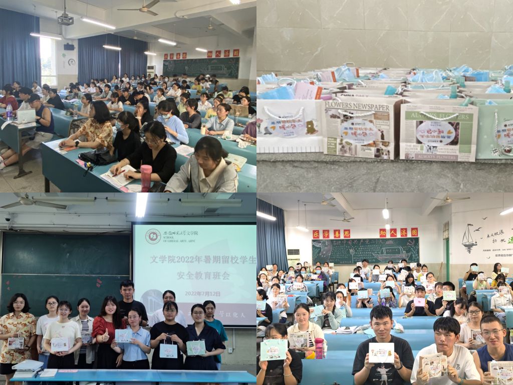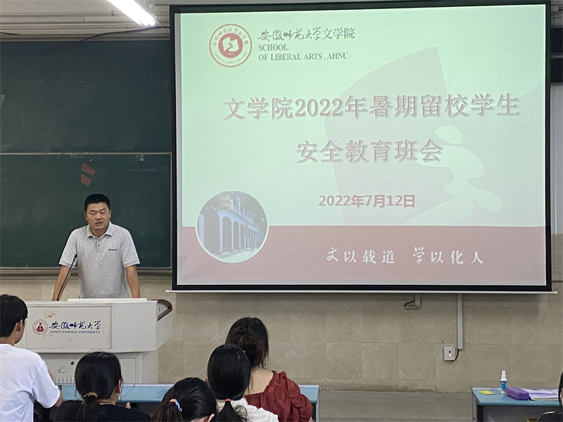 本网讯(代安保 林文啸)时值高温天气,为切实关心留校考研同学的生活学习状况,7月12日文学院于行知楼201-301教室开展了2022年暑期留校学生安全教育班会,文学院党委副书记刘飞出席本次会议,2019级辅导员唐宇晴主持班会,暑期留校学生全部到场参加。