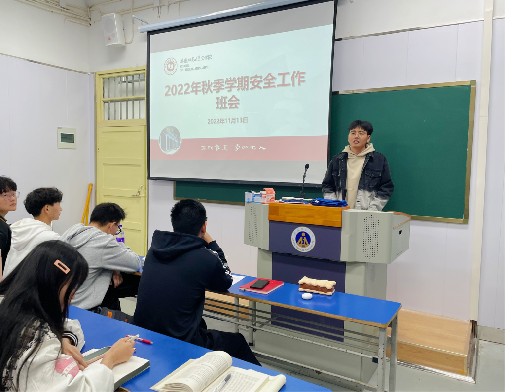 为增强同学们的安全防范意识,提高同学们的安全防范能力,全面普及校园安全常识,汉语言文学(师范)专业开展了“2022年秋季学期安全工作班会”,此次班会由辅导员冯文君主持,汉语言文学专业全体学生参加了此次班会。