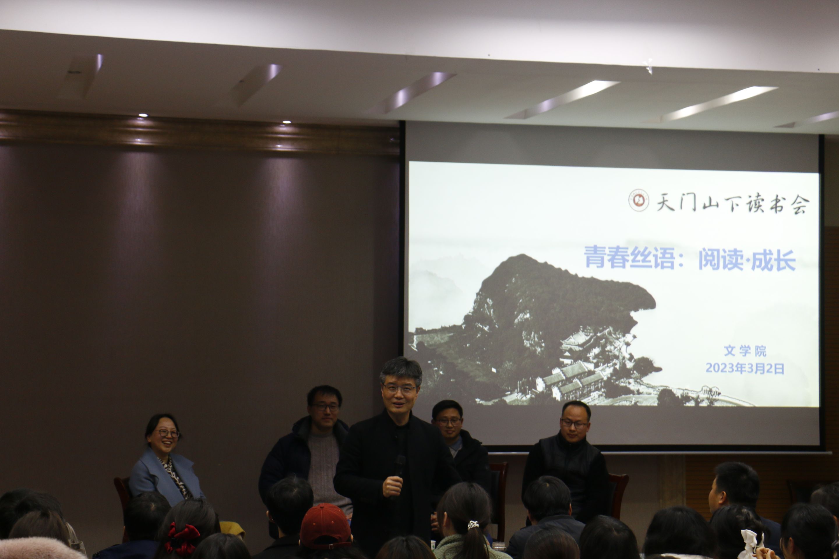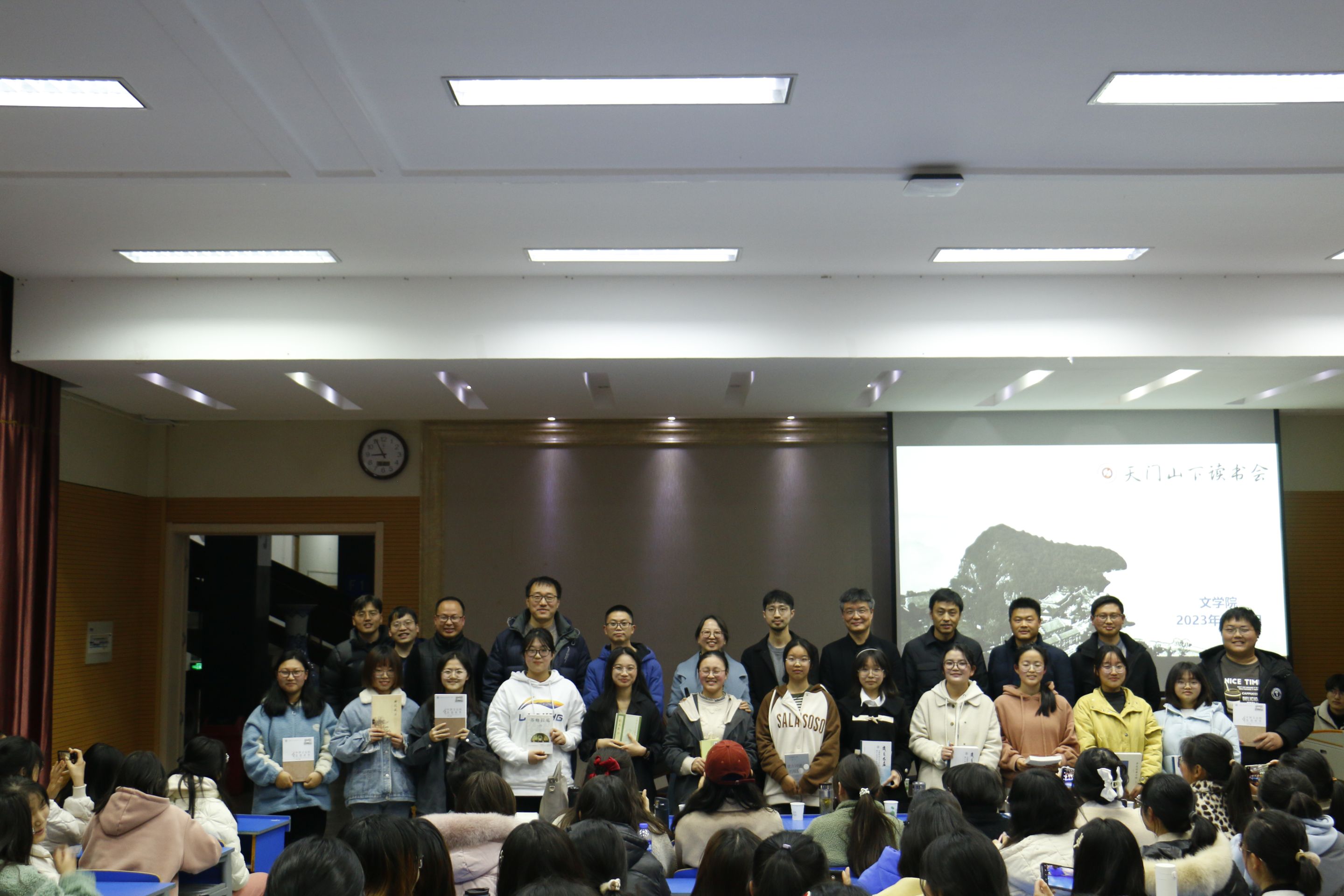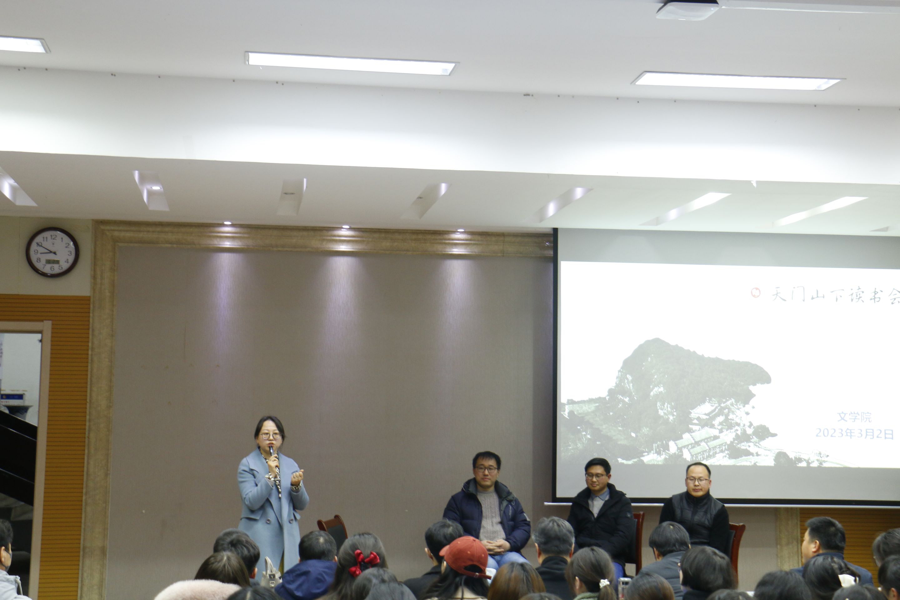 书香浸润校园,共读精彩人生。为激发青年学子阅读兴趣,养成良好的阅读习惯,营造浓郁的校园文化氛围,3月2日,文学院在天门山校区图书馆报告厅举行“天门山下读书会”宣讲会。文学院院长项念东,党委副书记(主持党委工作)戴和圣,党委副书记刘飞,青年教师刚祥云、程华清、黄瑞、叶庆兵、张士毅,2022级新生和专兼职辅导员参会本次活动。宣讲会由外国文学教研室主任张磊主持。