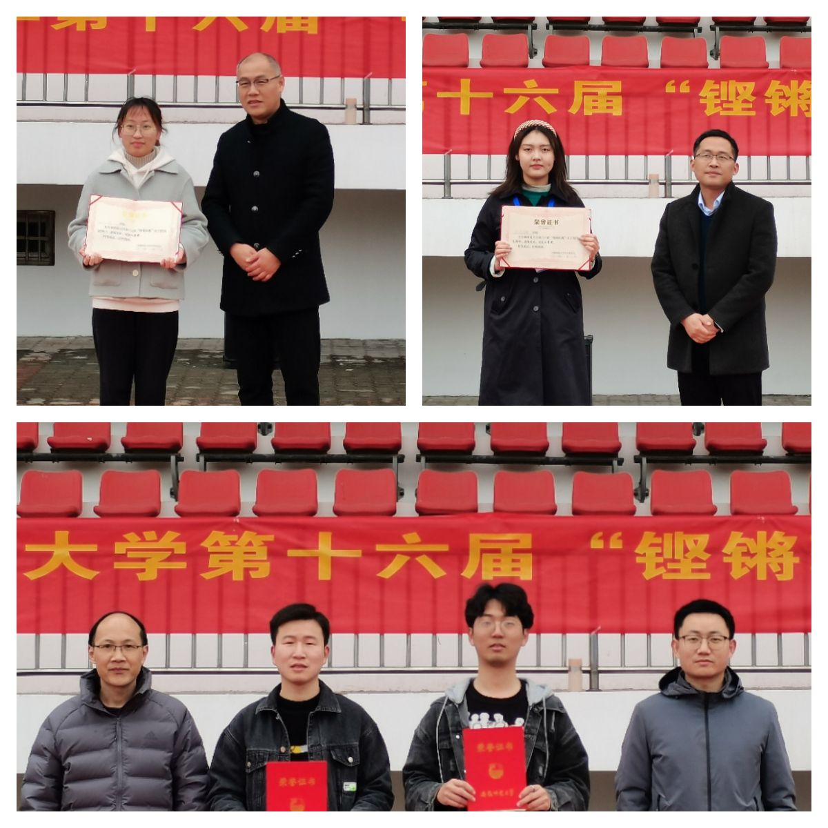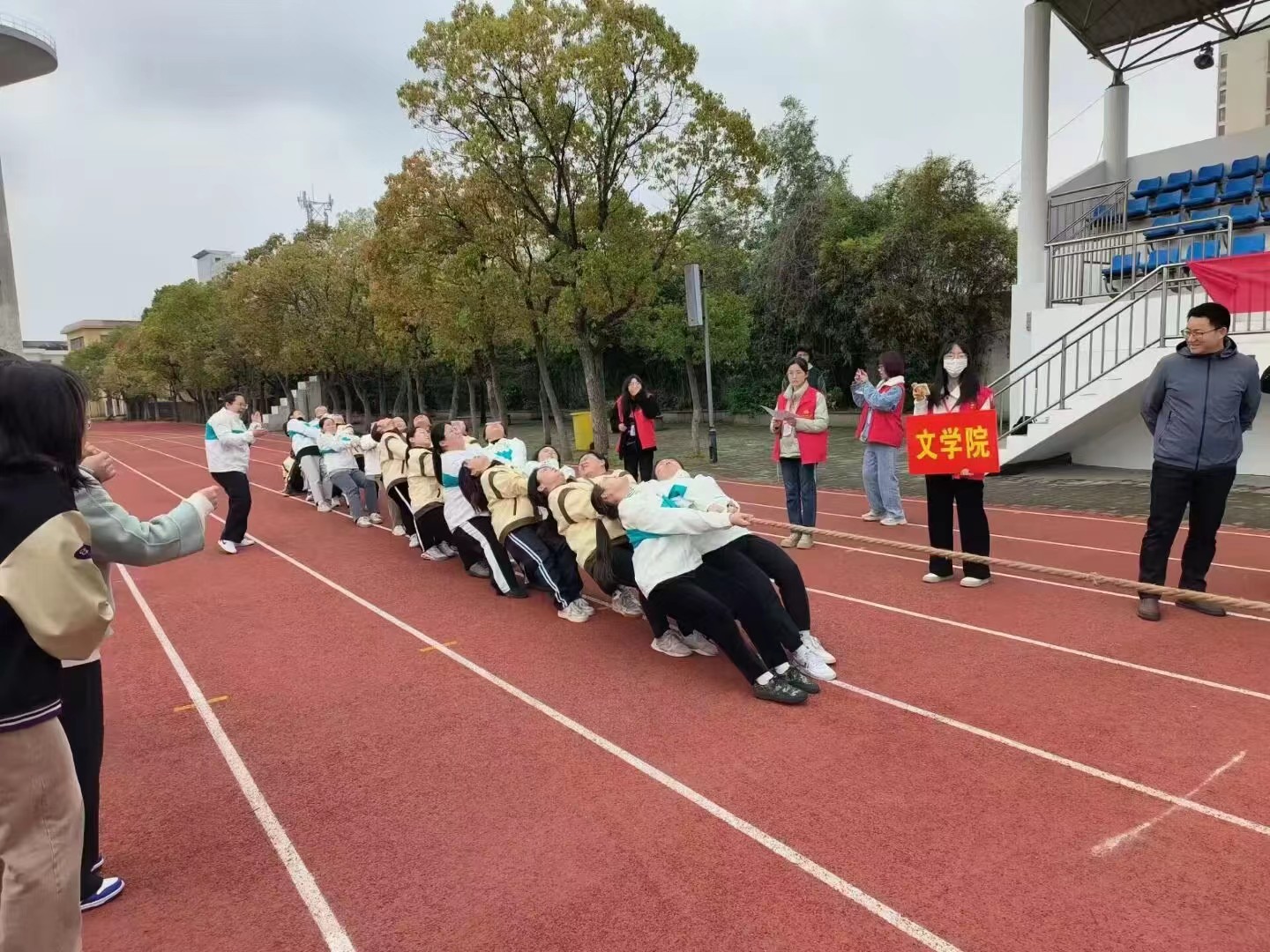 赛前,队员们充分热身、相互鼓劲,列队完毕后罗振宣布本次比赛开始。主裁判一声令下,选手们抓紧绳子,使出全身力气往后拉,场外观众的呐喊助威更是将比赛推上高潮。选手们拼尽全力,将“铿锵玫瑰”坚韧拼搏的精神传染给了现场的每一个人。经过激烈精彩的角逐,文学院获一等奖,经管学院获二等奖,法学院、历史学院获三等奖。罗振、左方敏、董书宝、汪暠为获奖团队颁奖。