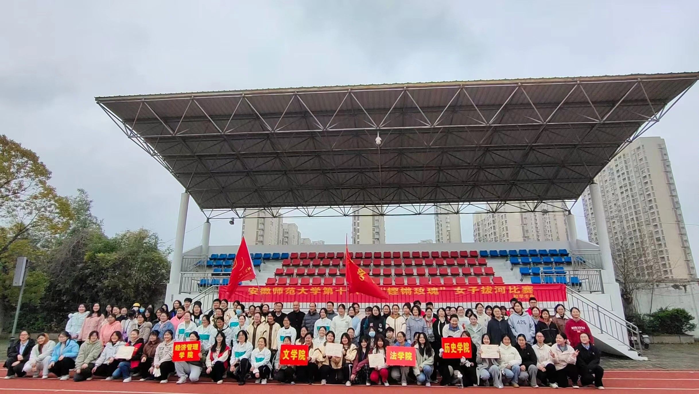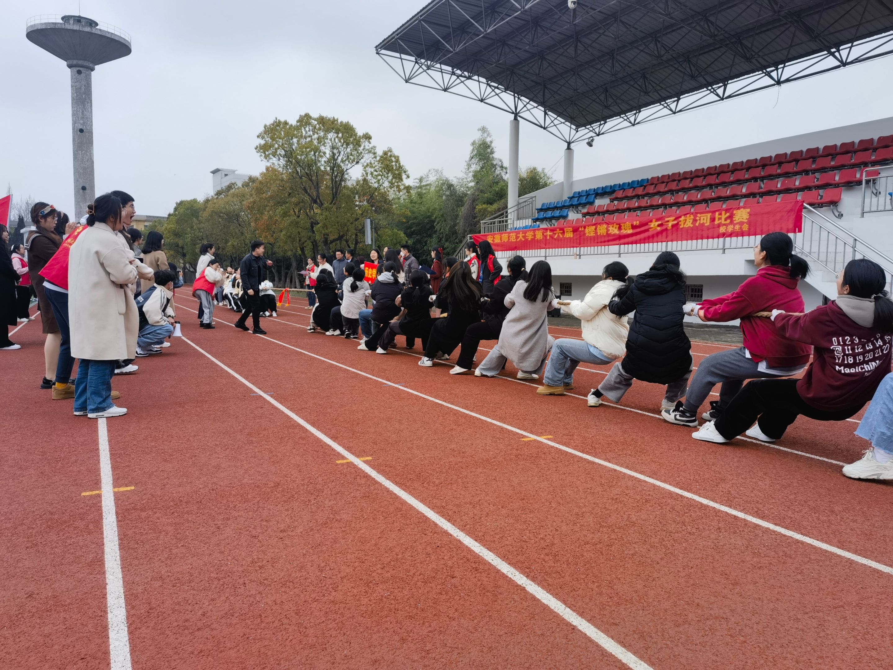 为进一步营造校园体育文化育人的氛围,展示女大学生蓬勃向上的精神风貌,3月18日上午,由校团委、学生会主办的校第十六届“铿锵玫瑰”女子拔河分校区比赛在天门山校区田径运动场举行。来自文学院、法学院、经管学院和历史学院4个学院的女大学生们参加了比赛。天门山校区管委会办公室主任罗振、副主任左方敏、教务管理部部长董书宝、综合部部长汪暠,及学生代表百余人参加活动。