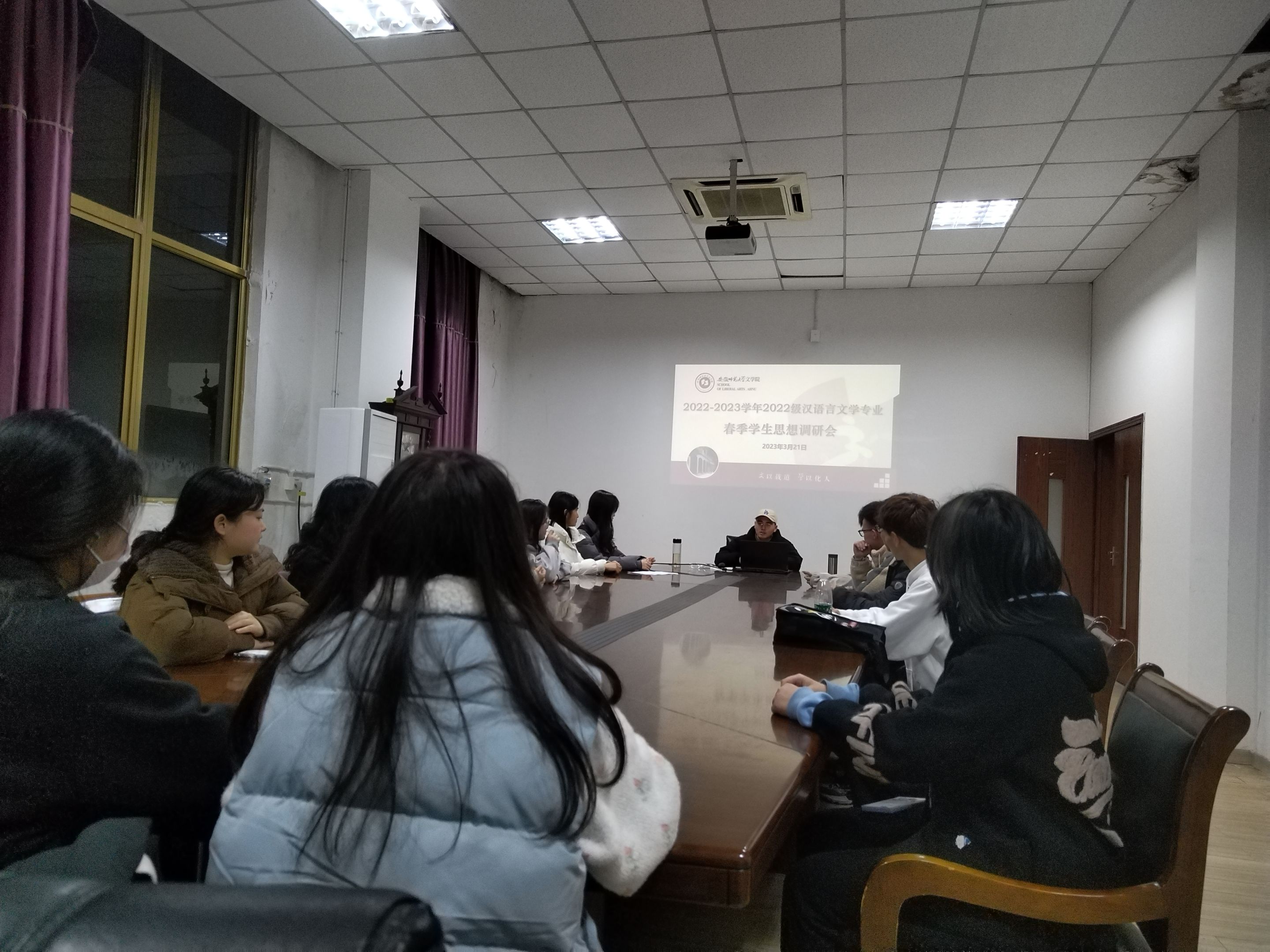 3月21日,22级汉语言文学专业于天门山校区第二会议室召开新学期思想调研座谈会,各班学生代表参加会议。会议由辅导员冯文君主持。