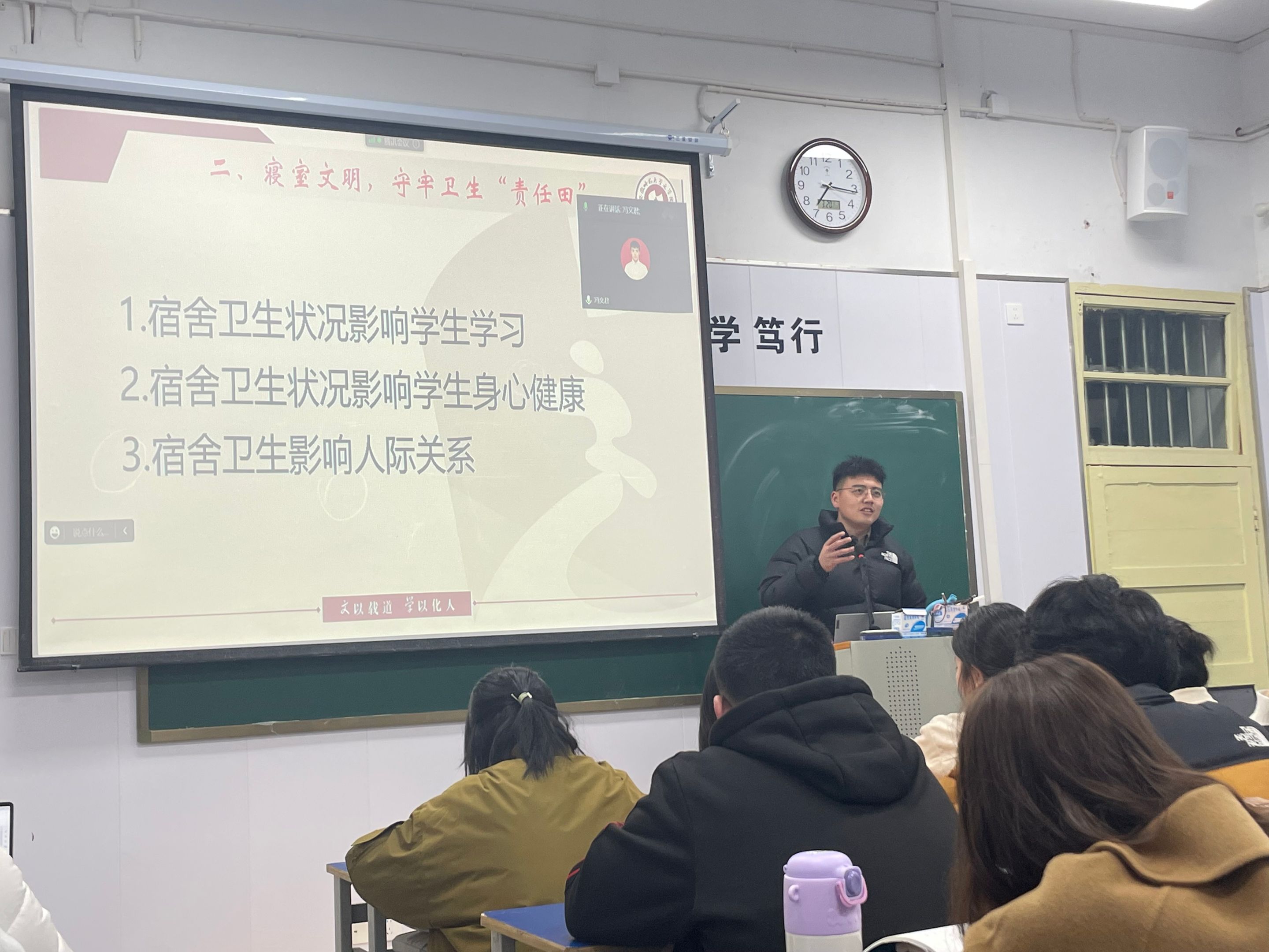 寝室文明,守牢卫生“责任田”。冯文君指出寝室不仅是同学们的生活住所,更是同学们的精神家园。良好的寝室卫生和寝室关系有助于同学们学习和身心健康不断发展。室友之间应该做到多包容、多理解,共同保持好寝室卫生,相互督促学习,一起进步,一起成长。他引导同学们向19级“四朵金花”学习,保持和谐寝室关系,争做文院学习标兵。