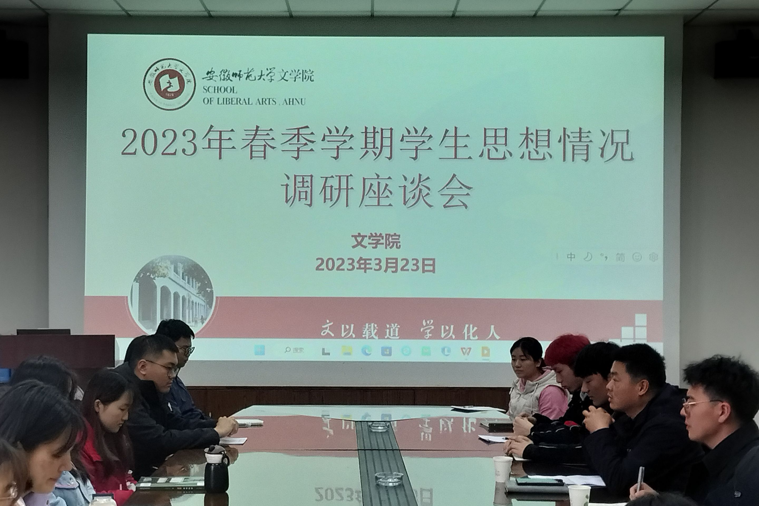 为了解掌握新学期学生思想情况,研究并解决学生在思想、学习以及生活等方面所遇到的难题,增强学生教育管理与思想政治教育工作的科学性、时效性和针对性,提供更优质的教育管理服务,助力学生成长成才,文学院于3月23日下午在天门山校区第一会议室召开了2023年春季学期学生思想情况调研座谈会,文学院党委副书记刘飞、新生辅导员冯文君以及学生代表出席本次座谈会。