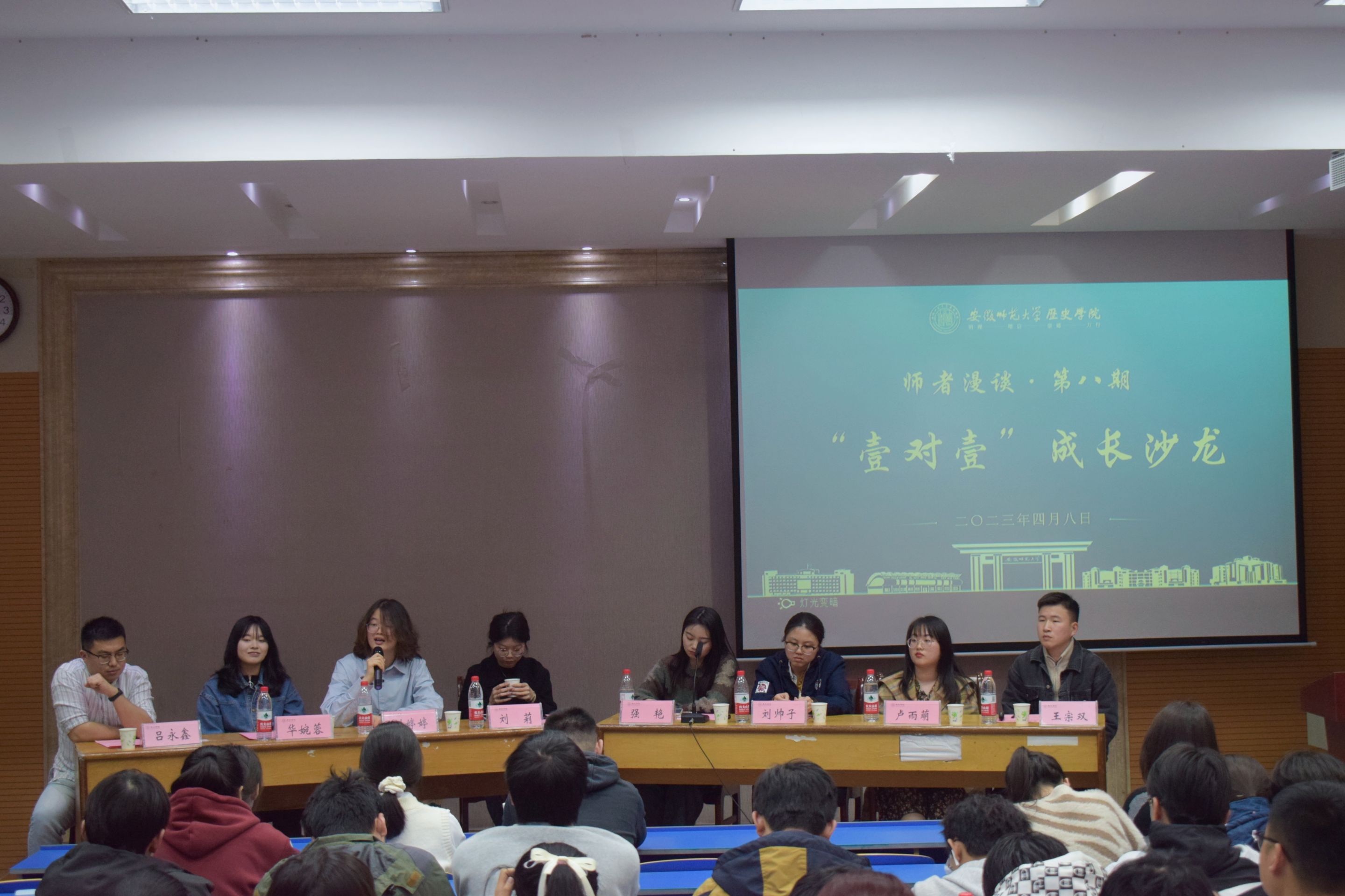 本网讯(历史学院 文/郝翘翘 图/钟毛迪)为纾解大一新生在学习和生活中的困惑,做好“拔节孕穗期”的引导。4月8日下午,历史学院研究生会、研究生党支部在天门山校区举办“第八期师者漫谈——壹对壹成长沙龙”活动。学院2022级博士研究生刘莉、2022级硕士研究生刘婷婷、华婉蓉、强艳、刘帅子、卢雨萌等应邀参会分享。本次师者漫谈由研究生辅导员吕永鑫和本科生辅导员王宗双主持,全体2022级本科生和部分研究生参与。
