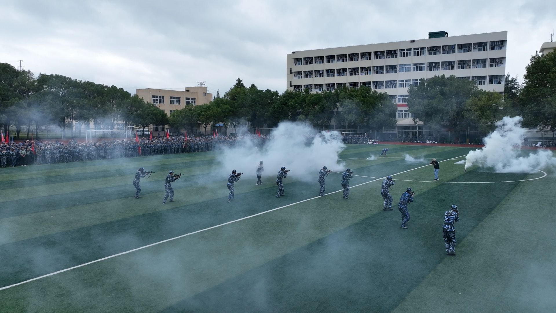 方阵的口号声震耳欲聋、响亮震天,斑斑迷彩似丛林里绽放的倔强的花,迎着秋风肆意盛放,同学们用饱满的激情、嘹亮的口号,积极向上的精神状态和端正的作风为21天的军训提交了完美的答卷。操场上阵阵的掌声和喝彩声,是肯定、更是精神风貌,展现的是学生艰苦奋斗、吃苦耐劳的毅力,积极向上、奋发有为的政治觉悟和爱国热情。