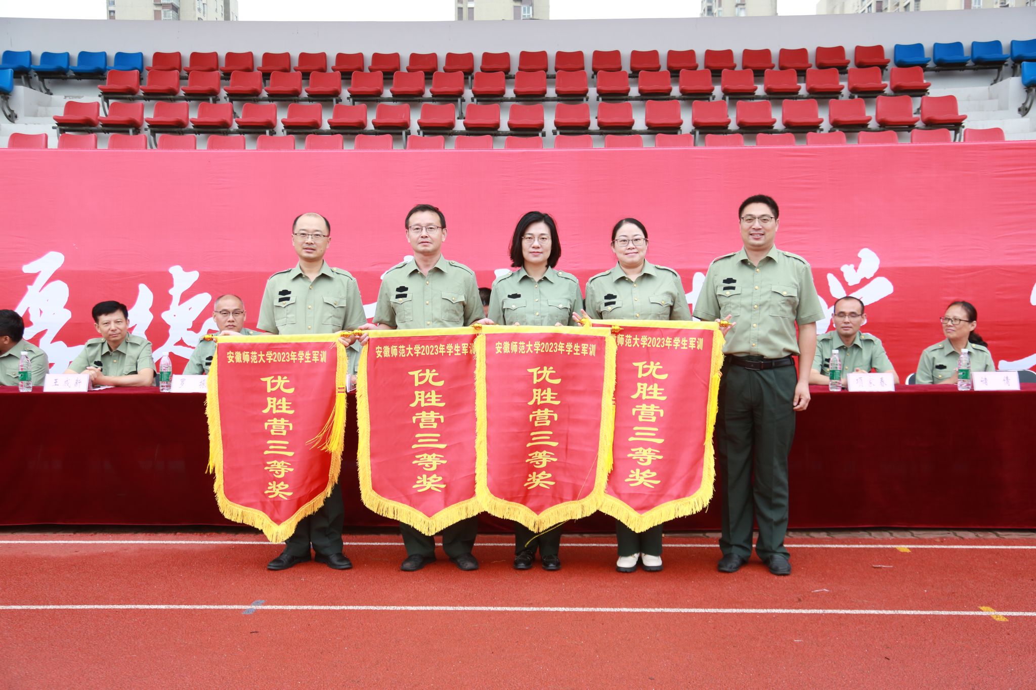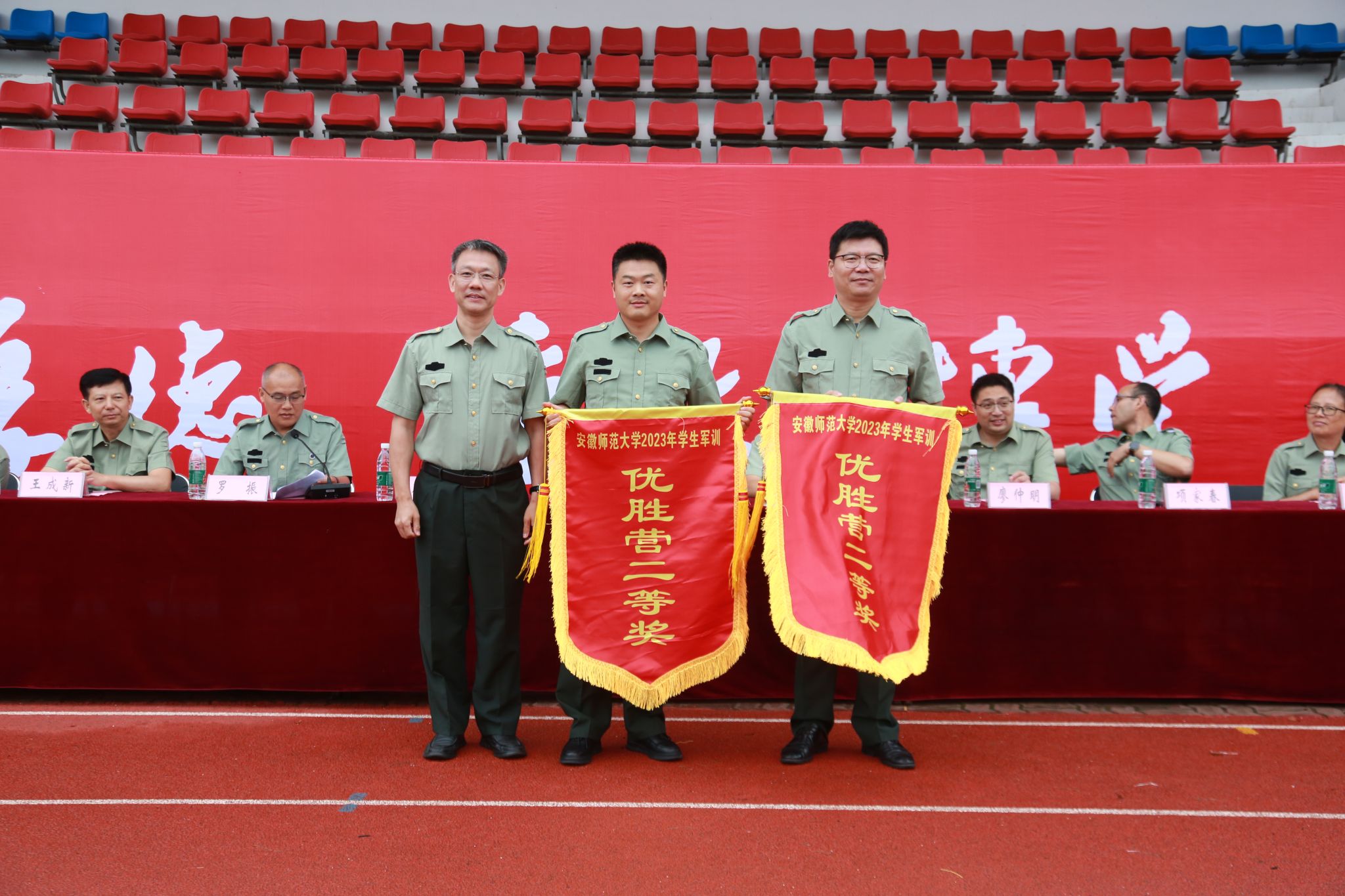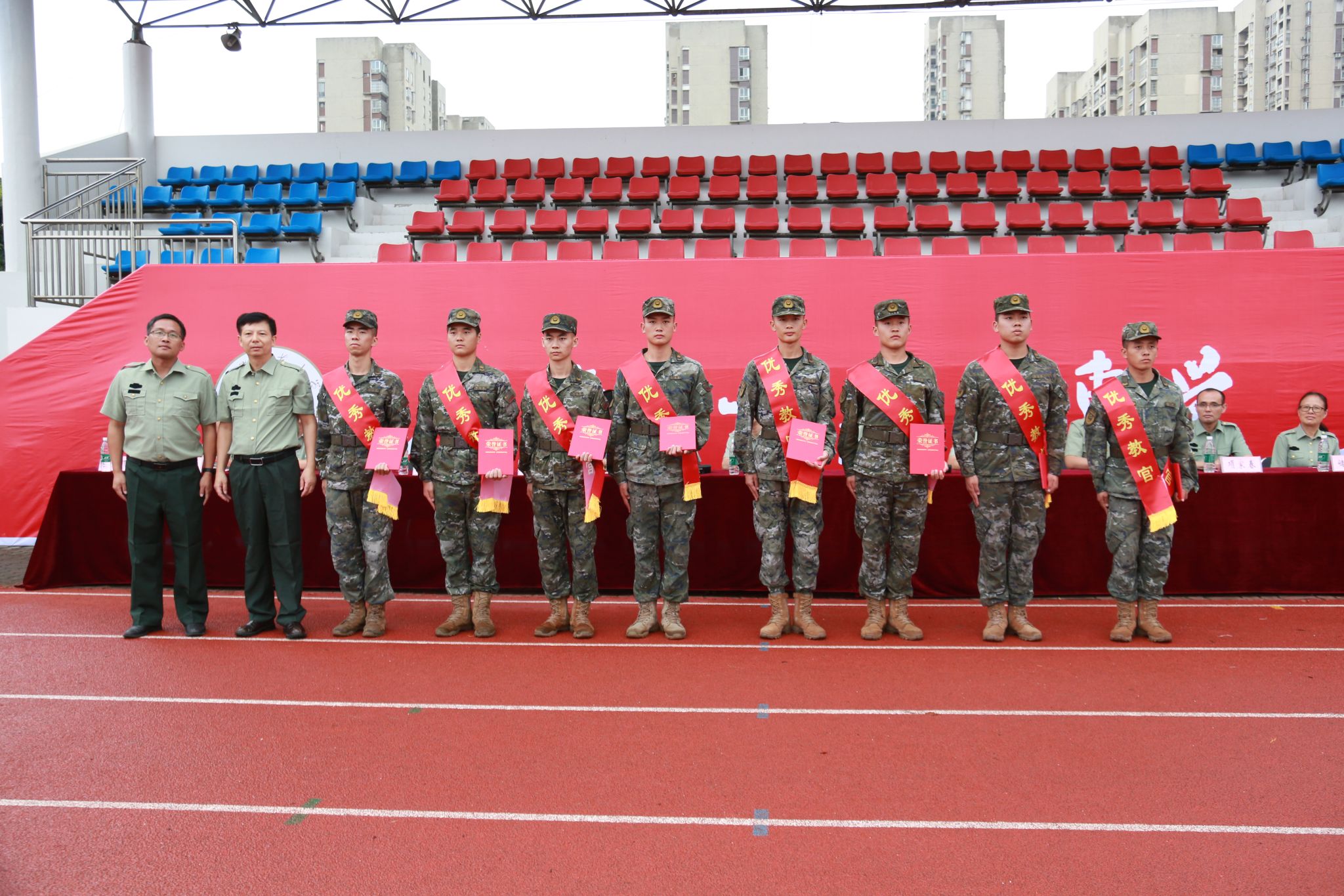 宋天辉代表军训旅宣读了军训营的总成绩。任永宣读了军训旅嘉奖令,授予经管学院、数统学院军训优胜营“一等奖”荣誉称号,外国语学院、文学院军训优胜营“二等奖”荣誉称号,法学院、美术学院、教科院、历史学院军训优胜营“三等奖”荣誉称号;授予经管学院四团三营一连、教科院五团四营四连、文学院四团一营三连、数统学院五团二营二连、法学院四团二营四连为军训“优胜连队”;授予钟爱一生等273名同学为军训“优秀学员”称号;授予胡慧等8名指导员为军训“优秀指导员”称号;授予潘海涛等8名教官为军训“优秀教官”称号。出席大会领导老师为以上受表彰的先进集体和个人颁发了锦旗和证书。