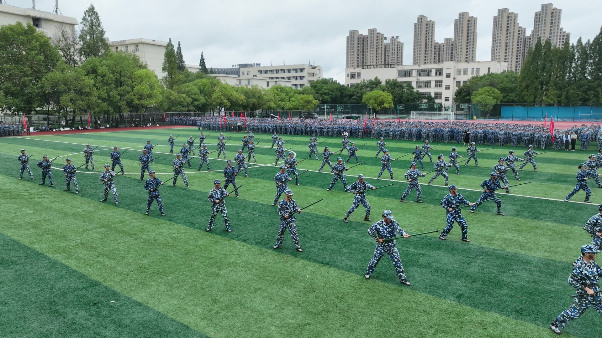 国旗护卫队步履铿锵、英姿飒爽,鲜红的五星红旗在秋风中自由飘扬,3200余名师生和教官面向国旗行注目礼,一同唱响国歌,庄重而热烈的氛围感染了每一个人。随着“按计划进行”的一声令下,《分列式进行曲》响彻操场,2023级本科生军训四团、五团的29个方队逐次进行分列式展示。同学们昂首挺胸的身影,如葱郁挺拔的白杨,青春风采在此刻尽情绽放。