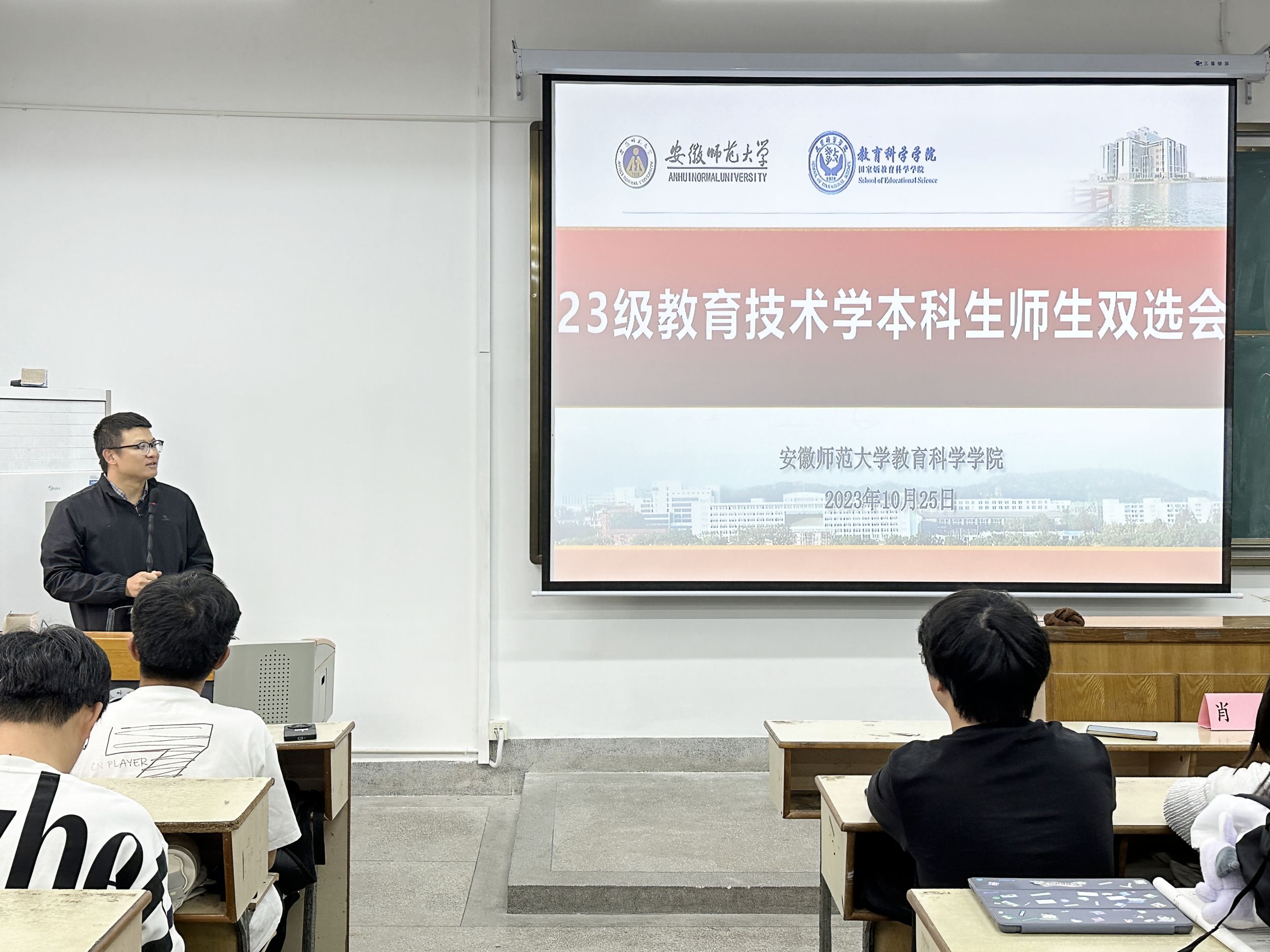 为帮助新生合理规划大学生活,做好导师双选工作,10月25日下午,学院于天门山校区主教学楼106召开2023级教育技术学召开本科生导师双选会。教育技术学专业负责人肖文、班主任白倩、辅导员金凤仙及全体2023级教育技术学本科生参会,会议由肖文主持。