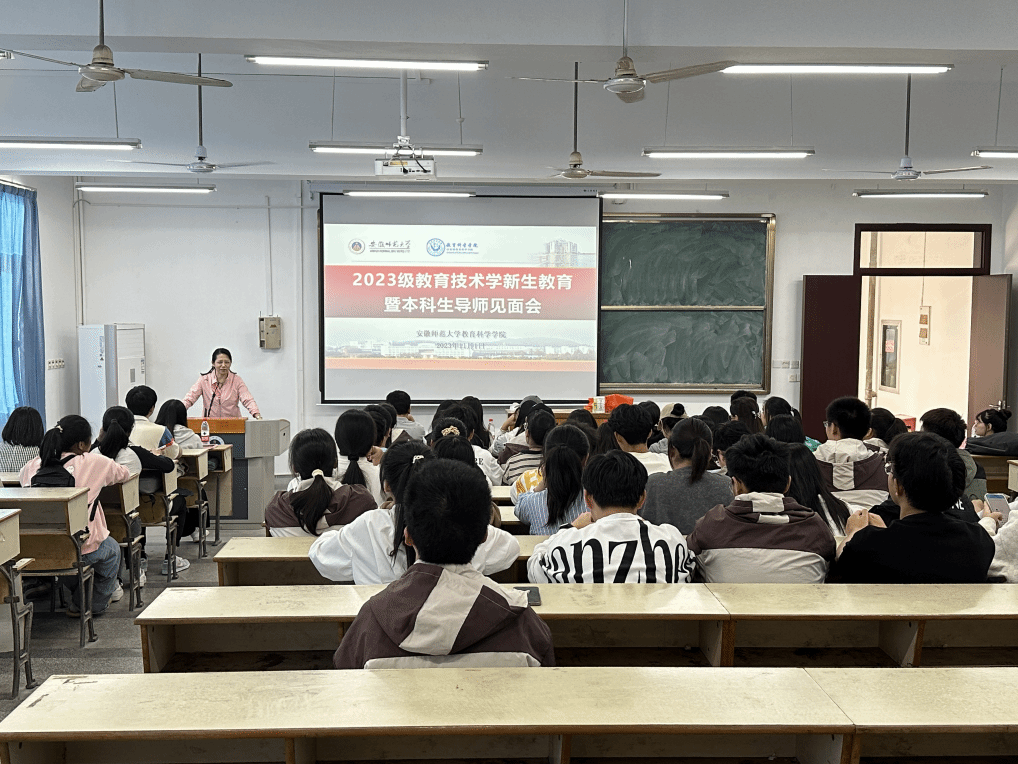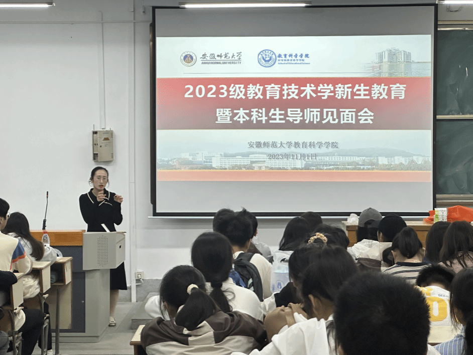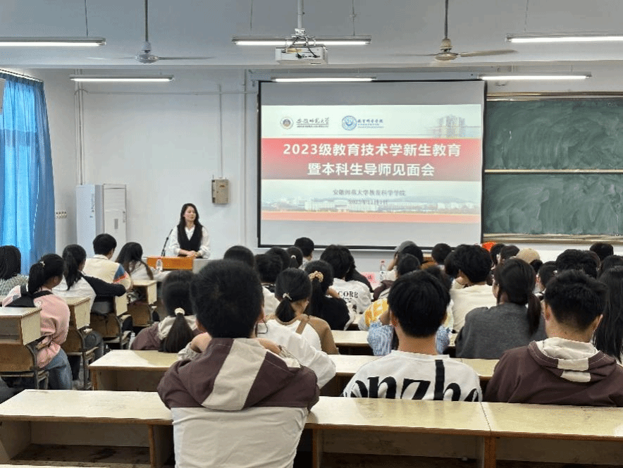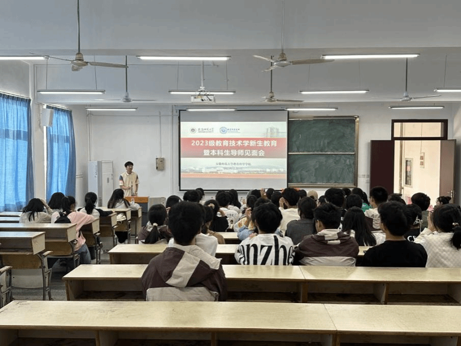 为增进学生与专业导师之间的相互了解和交流,11月1日下午,学院在天门山校区主教学楼306开展23级教育技术学专业本科生导师见面会。会议由班长刘健主持,专业负责人肖文,教育技术学教工党支部书记陶佳,辅导员金凤仙,新生班主任白倩,导师代表席鹏、吴钦金、叶方舟,优秀学生代表于思静以及全体23级教育技术本科生参会。会议伊始,刘健向同学们隆重介绍了参与本次活动的各位老师,并对老师们的到来表示热烈欢迎。