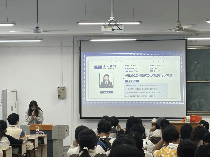 会议议程第四项,优秀学生代表于思静发言。于思静现以专业排名第二的成绩被推免至华南师范大学教育技术学专业继续攻读硕士研究生,她从课程学习、资格证书、学科竞赛和推免经验等四个方面向学弟学妹们传经送宝,希望大家都能成为自由且自律的人,成为自歌自舞自开怀,且喜无拘无碍的人。
