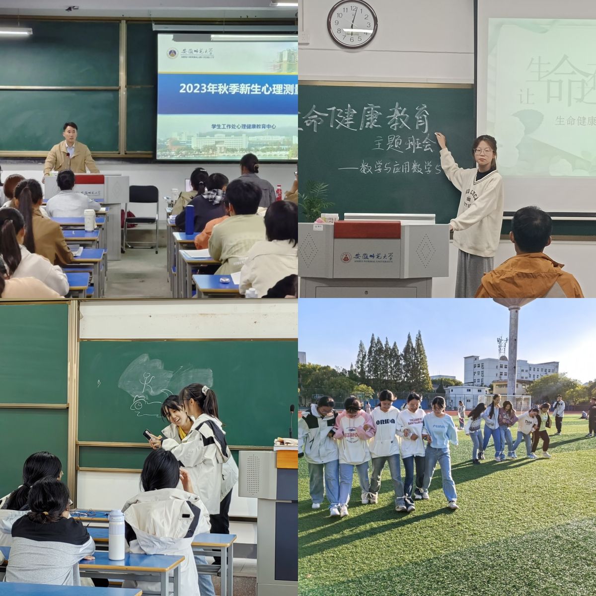 心理健康系列活动,关爱心灵护航成长。为护航大学生健康成长,提升学生心理健康素养,培育学生积极心理品质,数学与统计学院2023级本科新生在心理健康教育月期间,结合学院特色和工作实际开展“三个一”活动。一次心理健康状况摸排活动:辅导员分别在班级范围内开展心理测量、动态摸排学生心理健康状况;一次心理健康教育主题班会:各班级心理委员结合专业学习和生活实际,组织召开生命健康教育主题班会,着力提高学生珍爱生命意识;一次心理健康教育团辅活动:各班级全力策划、精心组织,开展“你画我猜”“躲猫猫”“放飞风筝释放烦恼”“独具匠心DIY”“集体庆生”等各具特色的团体游戏,放松心情,锻炼身体,增强体质,护航大学生全方位健康成长。