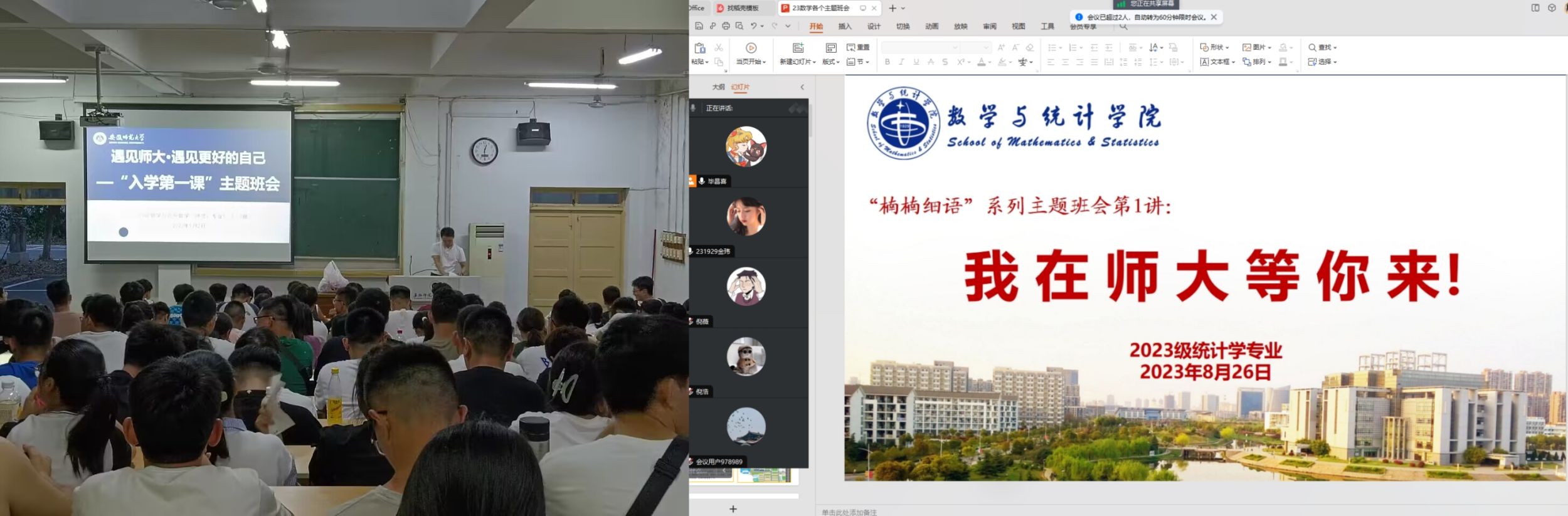 开学第一课主题班会,规划学业激活青春。为帮助全体新生以饱满的精神状态投入到学习中,呈现出新学期新气象的良好面貌,学院精心部署、统筹谋划。新生入学报到前,数学与统计学院各专业辅导员分别召开线上前置入学教育班会,通知入校报道的具体事宜,引领新生认识彼此,了解大学生活;新生入学报到后,辅导员召开“开学第一课”主题教育班会,主要围绕校史校情、院史院情、校规校纪、安全教育、宗教政策、文明礼仪以及大学生涯规划等方面进行介绍,帮助同学们了解学校、了解自我,形成对学校的认同感和归属感,更好适应大学生活,更快实现成长。