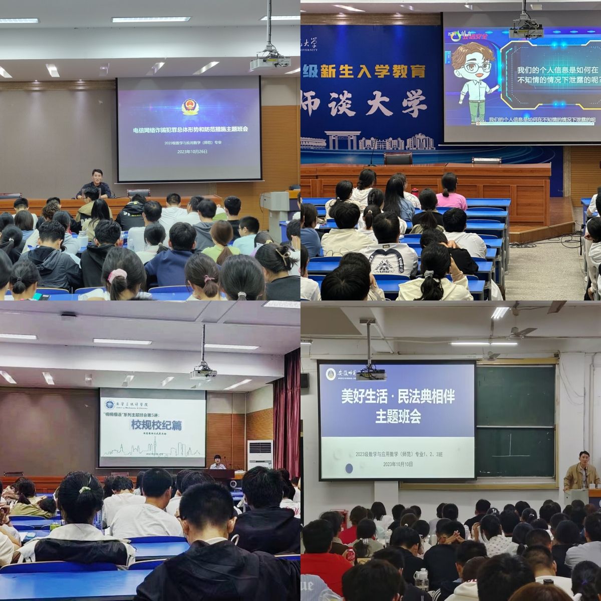 纪律教育系列报告,遵规守纪知法守法。为提高全体新生安全防范意识与避险能力,提升数统学子的纪律意识、制度意识、法治意识,新生辅导员先后开展三场以安全和纪律为主题的专题报告。校园安全教育专题报告会:分别从反欺诈财产安全、网络信息安全、生命安全、宿舍安全等方面,引导全体新生树立安全意识,筑牢安全防线。校规校级专题学习报告会:结合真实违纪案例对校规校级进行详细解读,引导学生自觉遵守校规校纪;民法典教育主题报告会:介绍民法典编纂和颁布的历程、重大意义和主要内容,勉励全体新生自觉增强法治意识,成为知法守法、懂法用法的合格大学生。