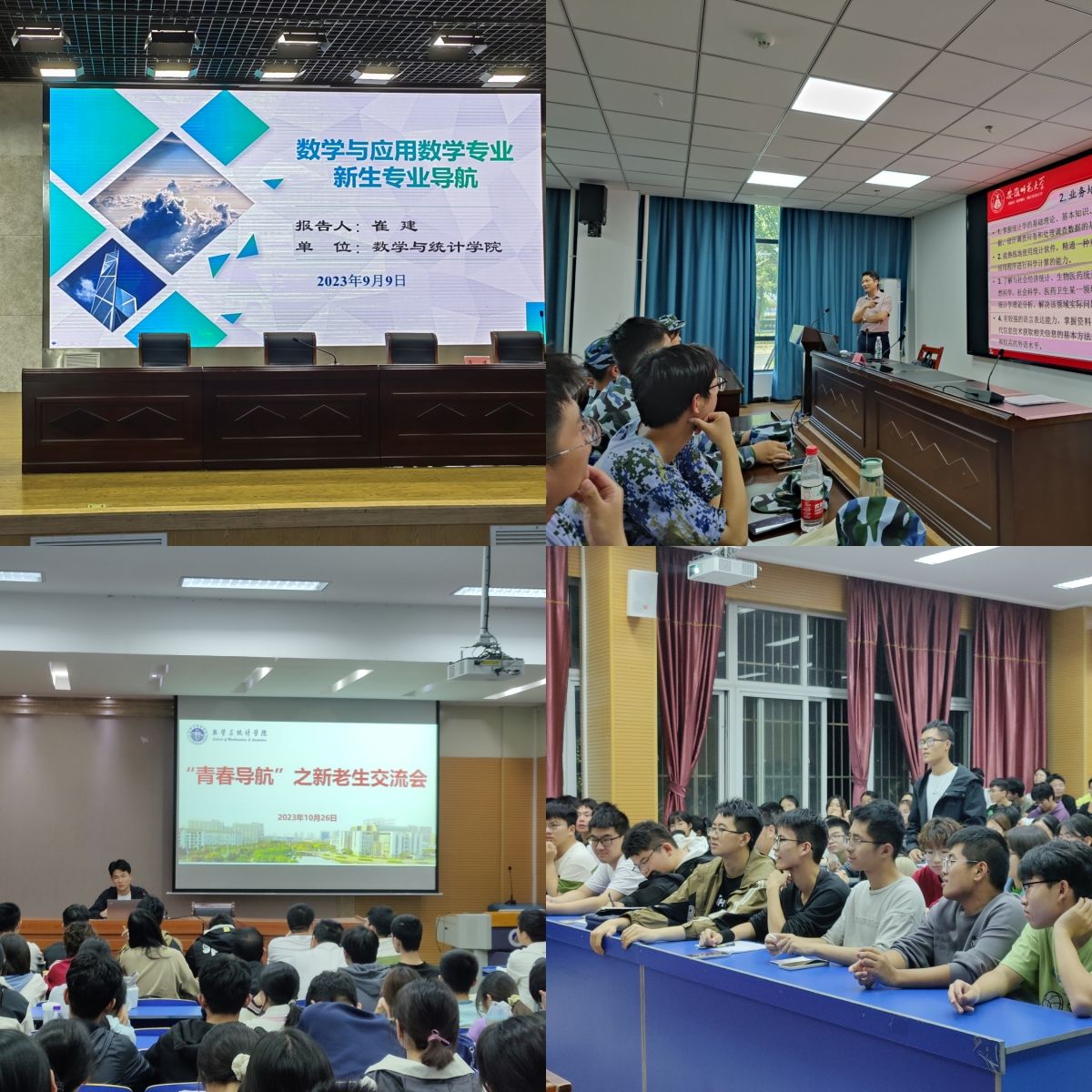 学业导航系列教育,共绘学业成长蓝图。为加强全体新生对学院的深入了解,加深专业认同感,明确学习目标,启发专业思考,数学与统计学院举办2023级新生学业导航教育系列讲座。一次专业导航教育会:数学与应用数学系主任崔建和统计系副主任郭明乐分专业介绍人才培养方案、课程设置和学习方法,与新生就专业学习方法、发展方向和就业前景进行交流探讨。一场青春导航交流会:邀请三位来自不同专业的高年级优秀学生代表,分别从专业课学习、暑期社会实践、学习生涯规划等多个方面与新生展开交流,为新生解疑答惑。一场学科竞赛经验分享会:分享了各自的参赛历程与体会,传授高分获奖技巧,并鼓励学科竞赛作为一场竞技类赛事,学生们要做到坚持,不畏惧困难,迎难而上。鼓励大一新生们尽快适应并融入大学生活,明确学习和成长目标并为之努力奋斗。