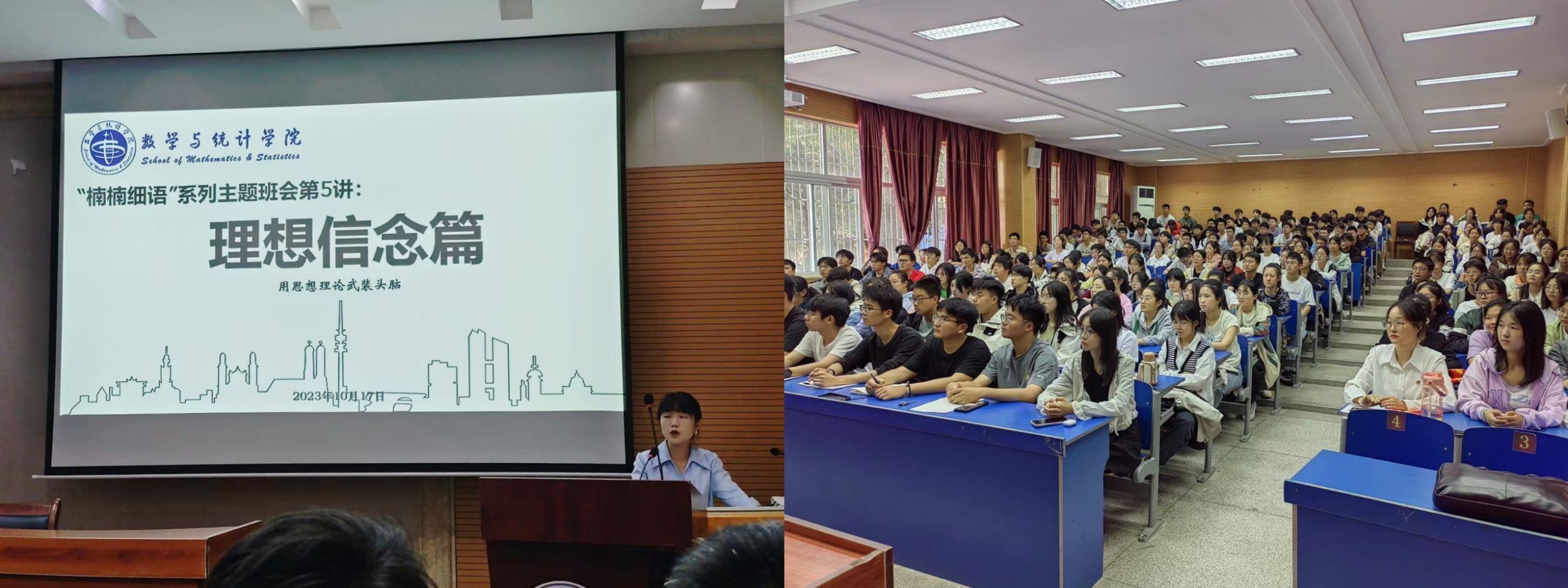 理想信念主题教育,凝心铸魂筑牢根本。“青年兴则国家兴,青年强则国家强”,青年的理想信念关乎国家未来。数学与统计学院2023级本科生辅导员潘楠楠主持召开理想信念主题教育班会。从革命先烈的英勇事迹到抗击疫情的普通群众,从个人理想到社会理想,潘楠楠用一个个生动鲜活的人物事例将理想信念之重要意义娓娓道来。引导全体新生树立远大理想,坚定中国特色社会主义共同理想,并激励同学们,作为当代大学生生逢其时,应该把握机会,“仗凌云之志气,明万物之法理”,在强国建设、民族复兴的历史潮流中确立正确的人生目标,为一生的奋斗奠定基石。