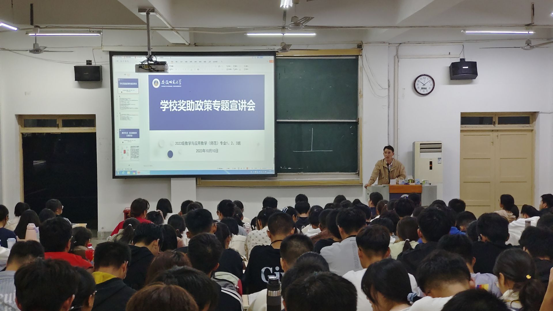 奖助政策宣讲,强化资助诚信教育。为增进全体新生对学校资助政策的了解,加强资助政策宣传,数学与统计学院2023级本科生辅导员毕昌喜主持召开学校奖助政策专题宣讲会。宣讲会内容主要围绕学校奖助学金的种类、申请条件、注意事项等方面展开详细介绍,引导教育接受资助的同学懂得感恩、努力学习,自觉服务社会,并向同学们强调诚信是立身之本,作为新时代的大学生,应该高度重视诚信意识的培养和践行,积极弘扬社会正能量,做诚实守信的大学生。