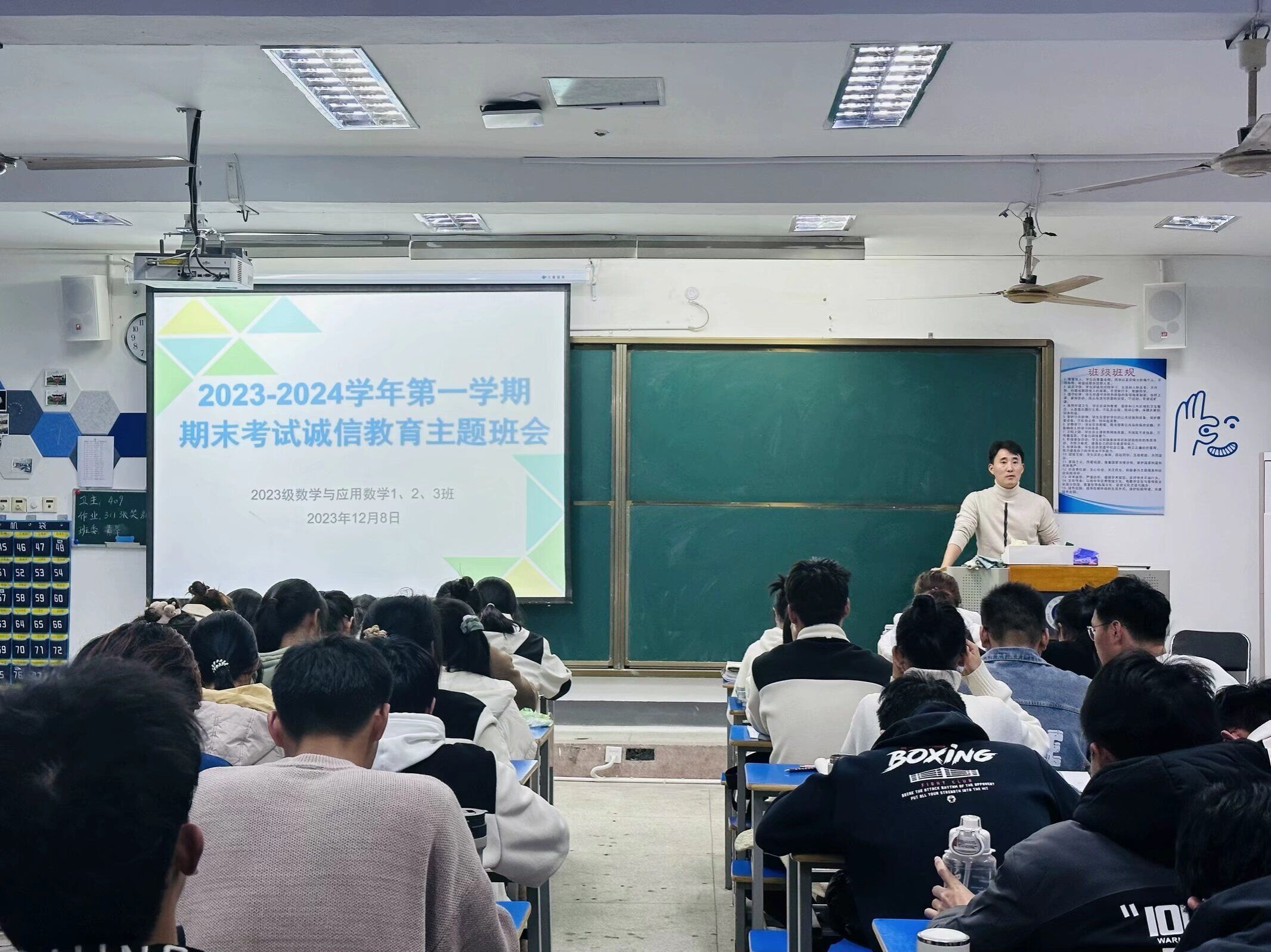为加强期末考试诚信教育,锤炼诚信品质,营造良好的班风学风。2023年12月8日,2023级数学与应用数学(师范)1、2、3班分别在天门山校区主教学楼105、205教室召开期末考试诚信教育主题班会。2023级数学与应用数学(师范)1、2、3班全体同学参加了本次班会。班会由辅导员毕昌喜主持。
