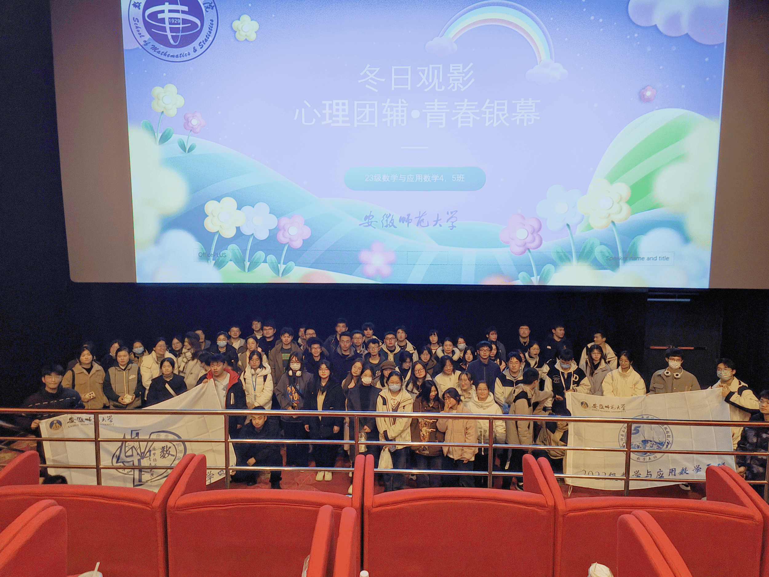 为关爱学生心理健康,共筑美好未来,2023级数学与统计学院数学与应用数学(师范)4、5班于12月6日在伟星·星悦广场开展“心理团辅,银幕青春”冬日观影活动,2023级数学与应用数学(师范)4、5班全体同学参与活动。