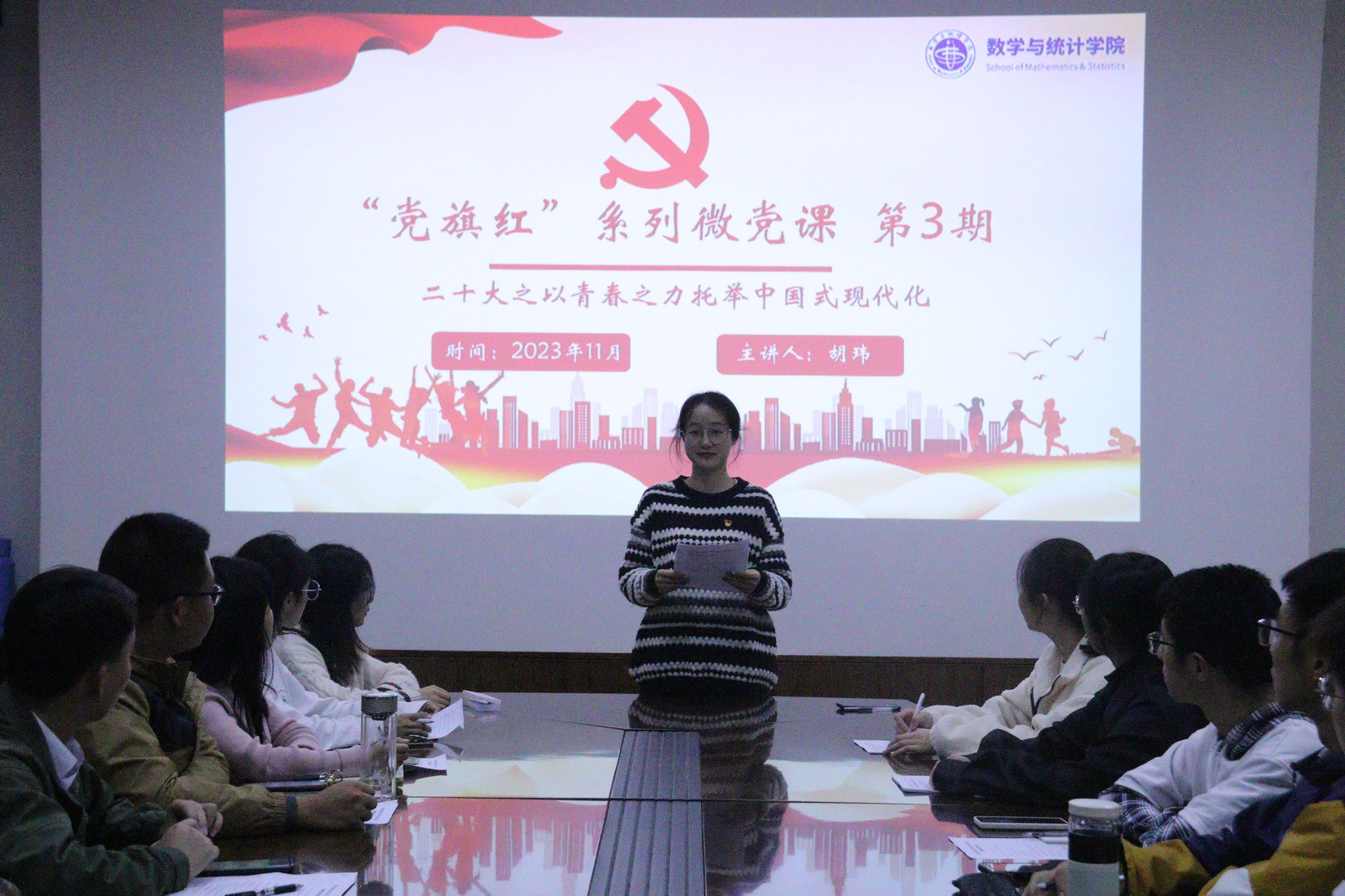 讲授一堂“专题党课”,铭记初心使命。邀请学院先锋宣讲团成员胡玮讲授“党旗红”微党课,她在党课中阐释了“什么是中国式现代化”“为什么走中国式现代化治之路”“如何以青春之力助力中国式现代化”三个问题。她强调青年学子要始终铭记初心使命,在实践中努力成长为堪当民族复兴重任的时代新人,以实干投入中国式现代化的历史洪流中。