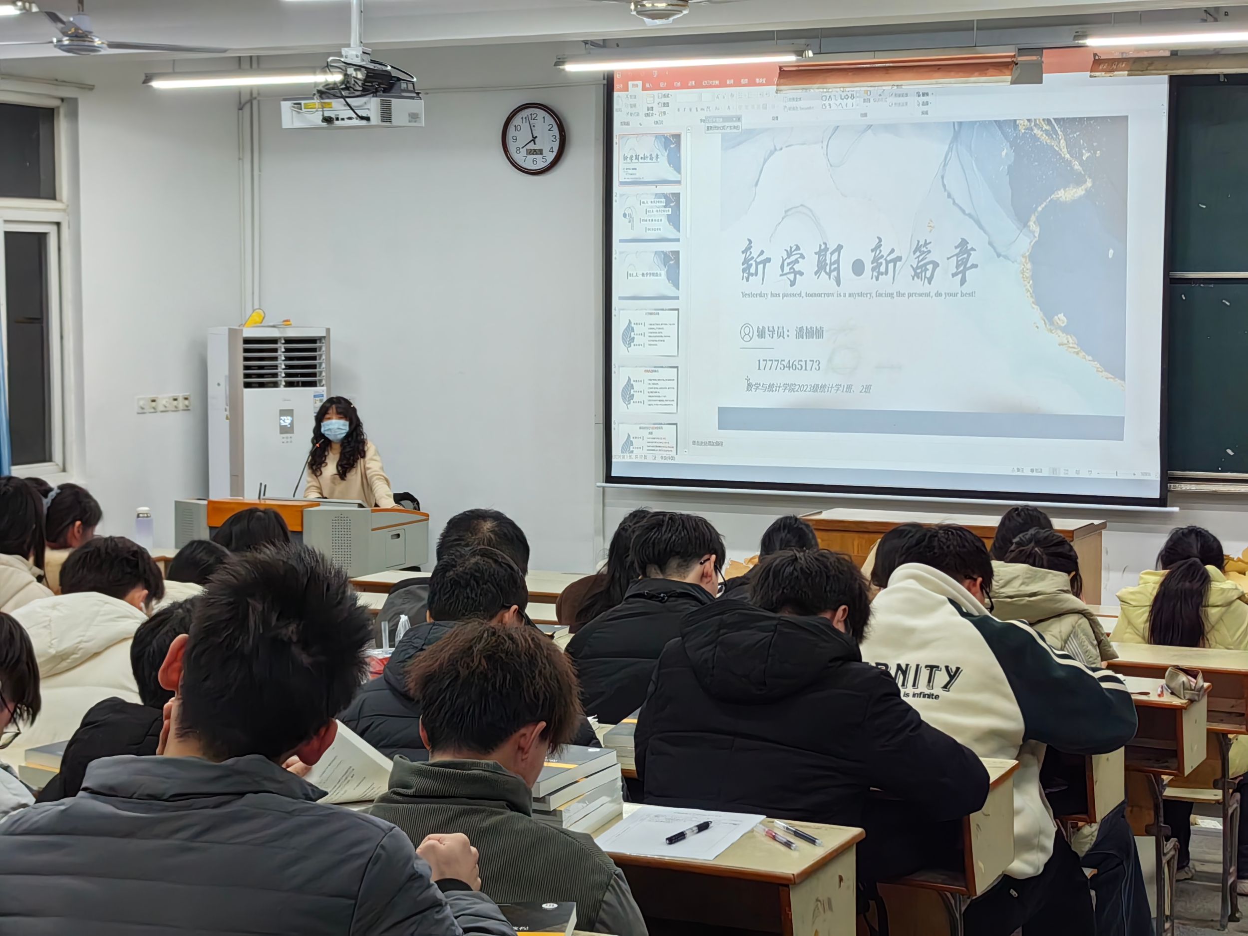 新学期翻开新篇章。为了帮助学生快速调整状态、适应新学期,增强学生的安全意识,提高防范能力。2月25日晚上,2023级统计学专业在天门山校区辅楼206召开春季开学第一次班会,会议由辅导员潘楠楠主持。