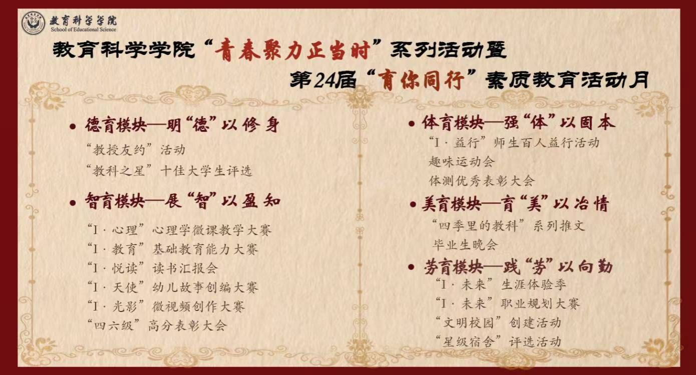 在学院的精心筹备下,本届素质教育活动月从兴“德”修身、兴“智”固本、兴“体”自强、兴“美”化人、兴“劳”履践五个方面陆续展开,素质教育活动月是学院落实立德树人根本任务和坚持五育并举的重要形式,在丰富校园文化同时,鼓励教科学子奋发前行,提高综合素质,引导同学们争做全面发展的新时代好青年。