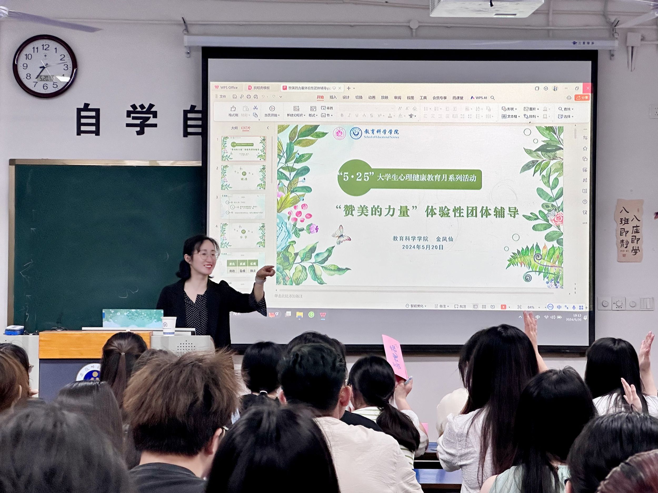 为促进学生心理健康,赋能学生人际交往,教育科学学院5月20日晚在天门山校区北教202开展“赞美的力量”体验性团体辅导,此次活动共计200余人报名,经过筛选共有40余名同学参与其中,活动由2023级专职辅导员金凤仙带领。